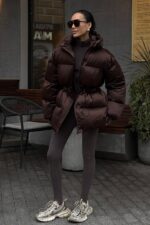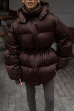 Женская Зимняя Объемная Коричневая Куртка Пуховик Айс с Капюшоном и Затяжками на Талии
