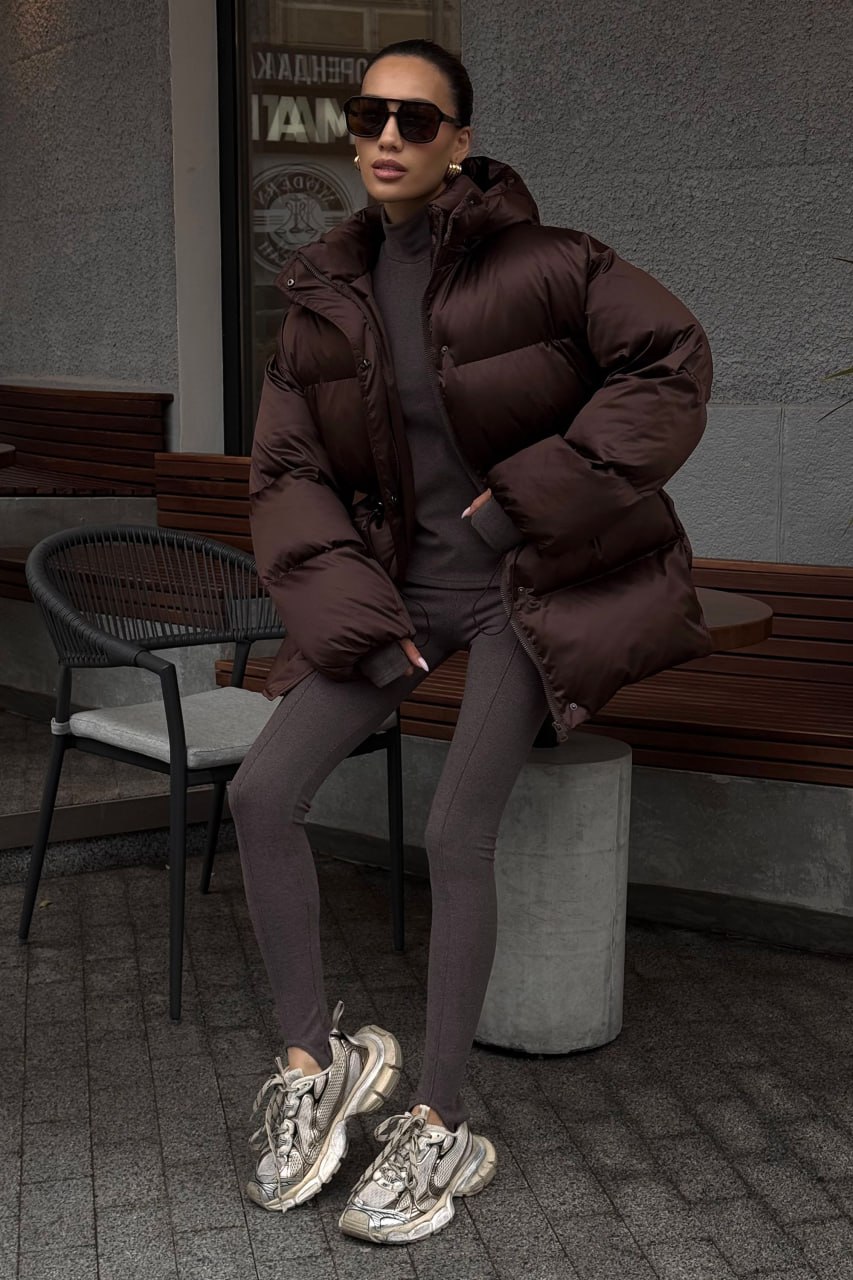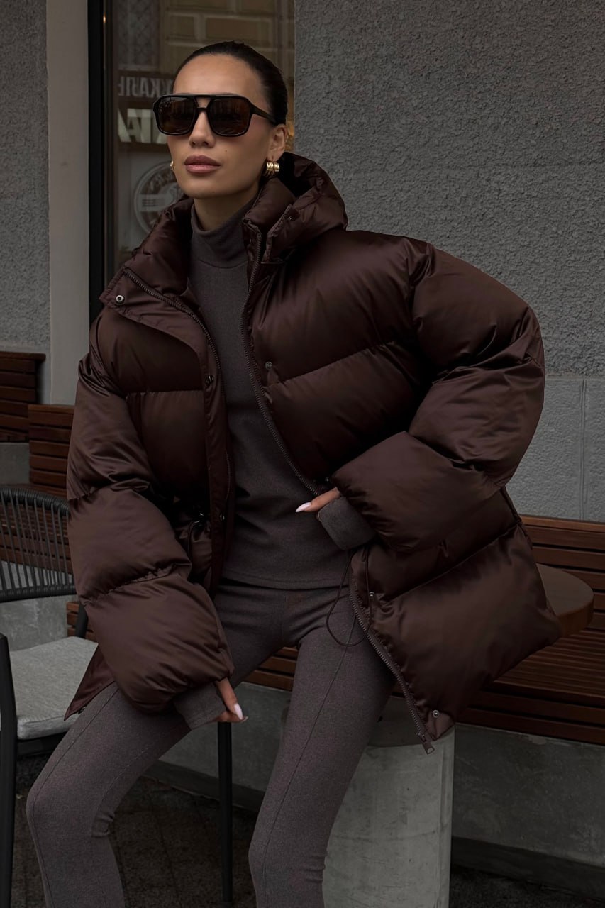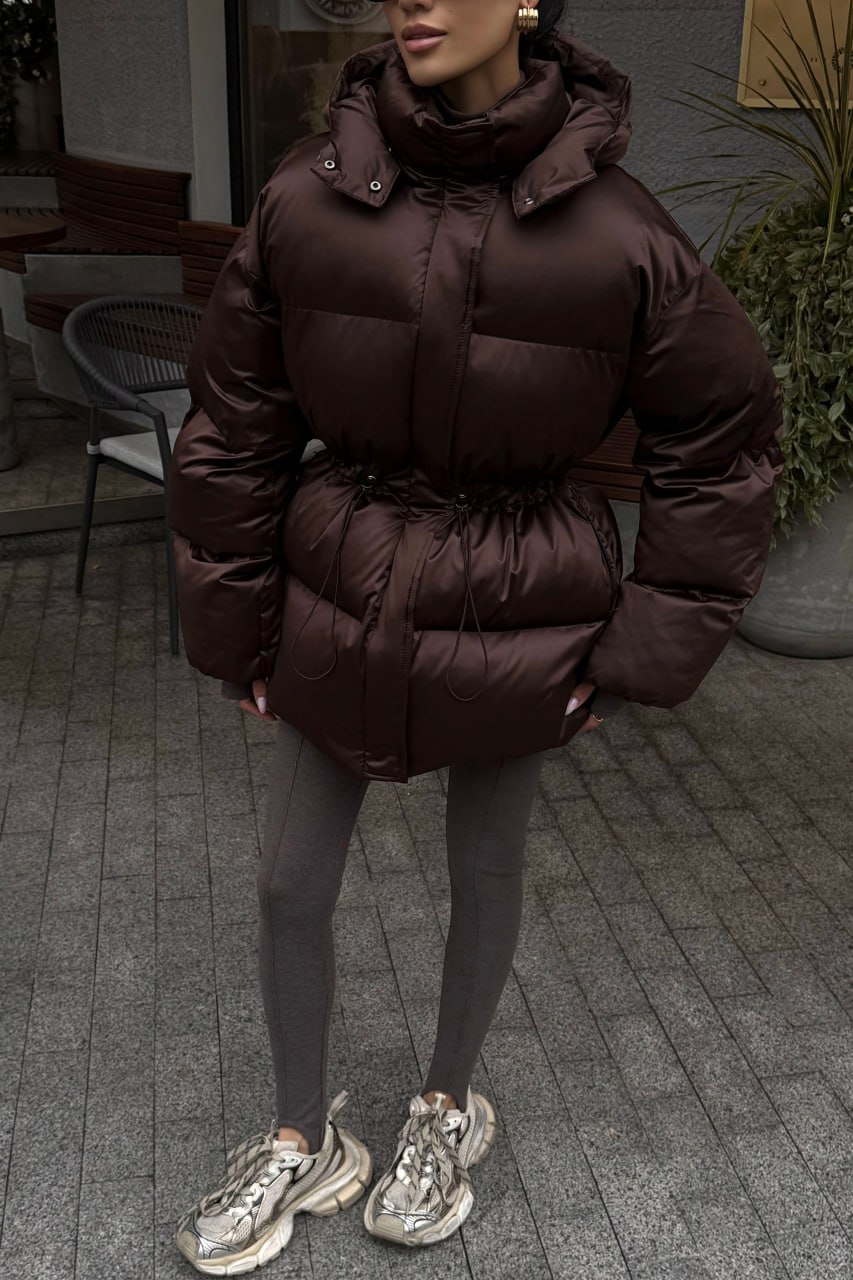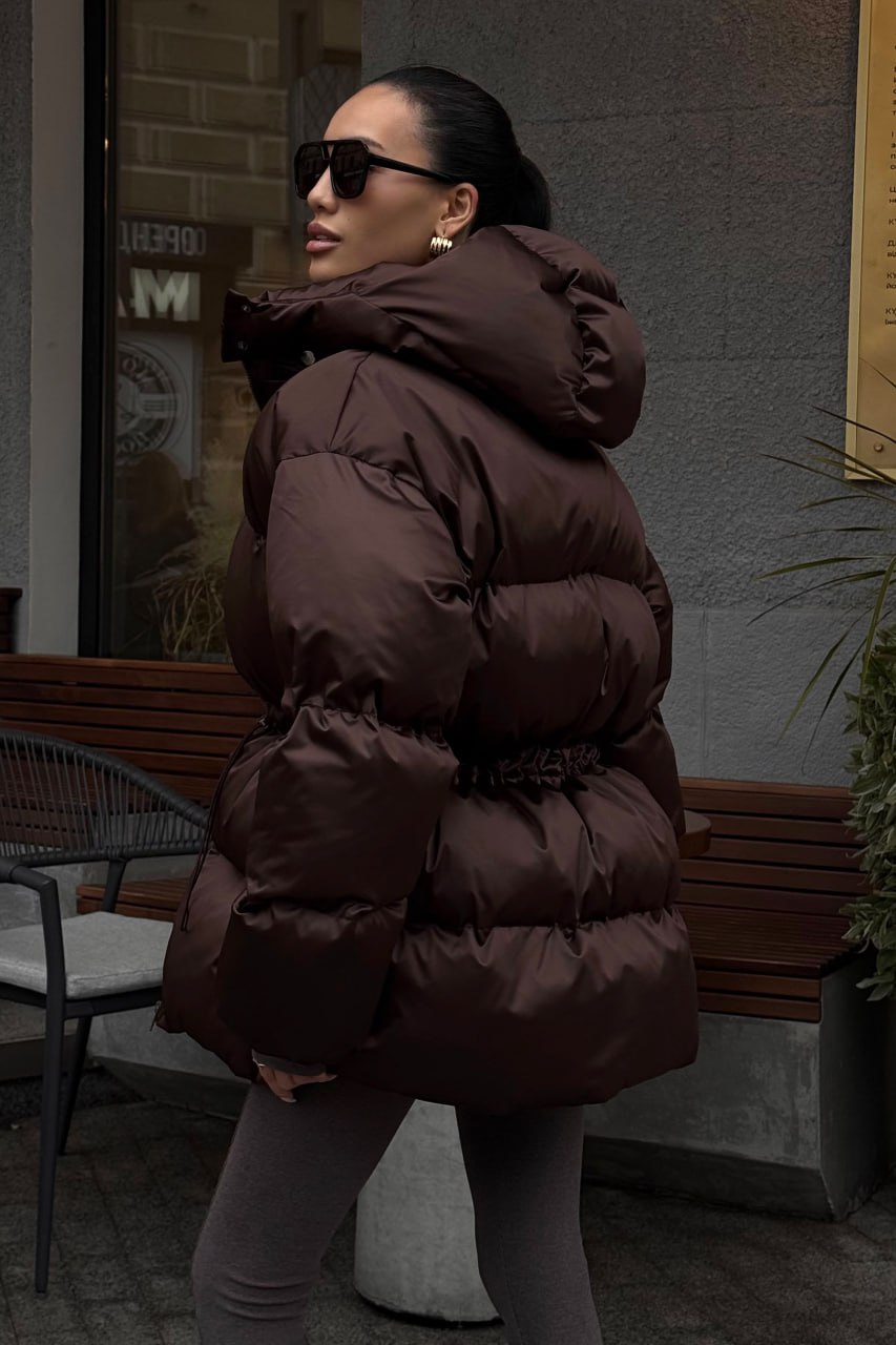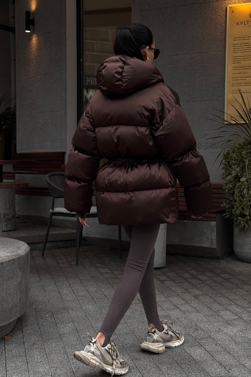 Женская Зимняя Объемная Коричневая Куртка Пуховик Айс с Капюшоном и Затяжками на Талии