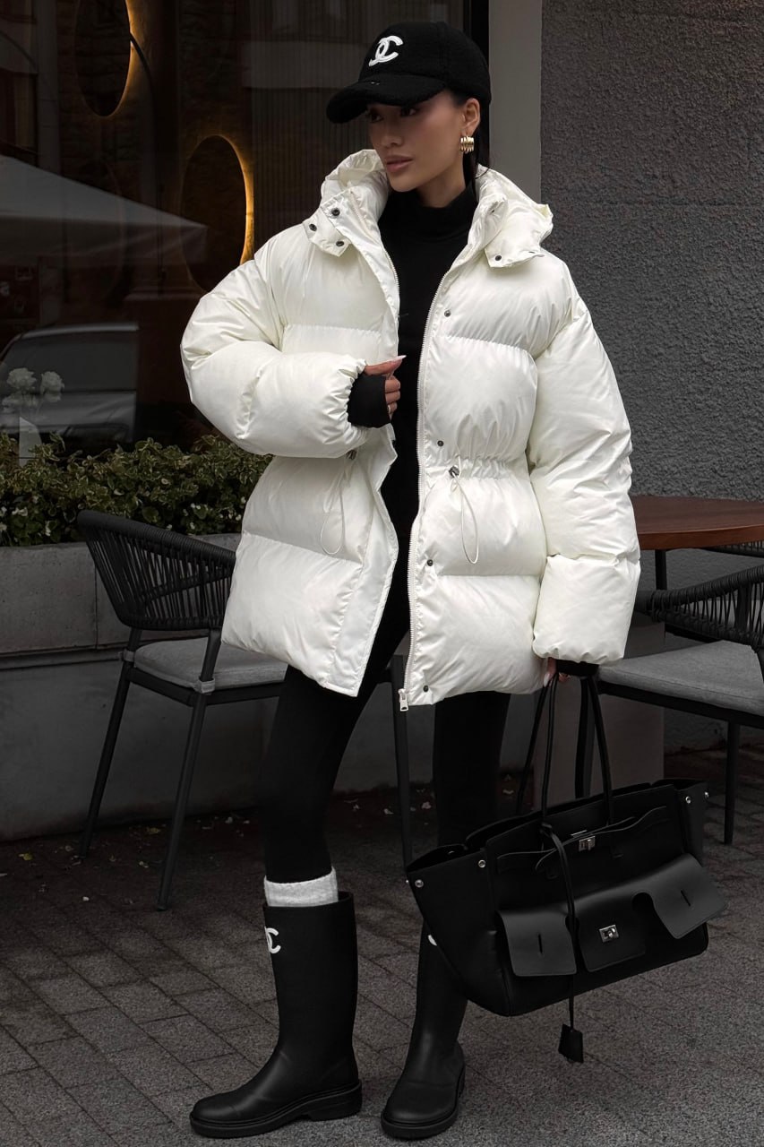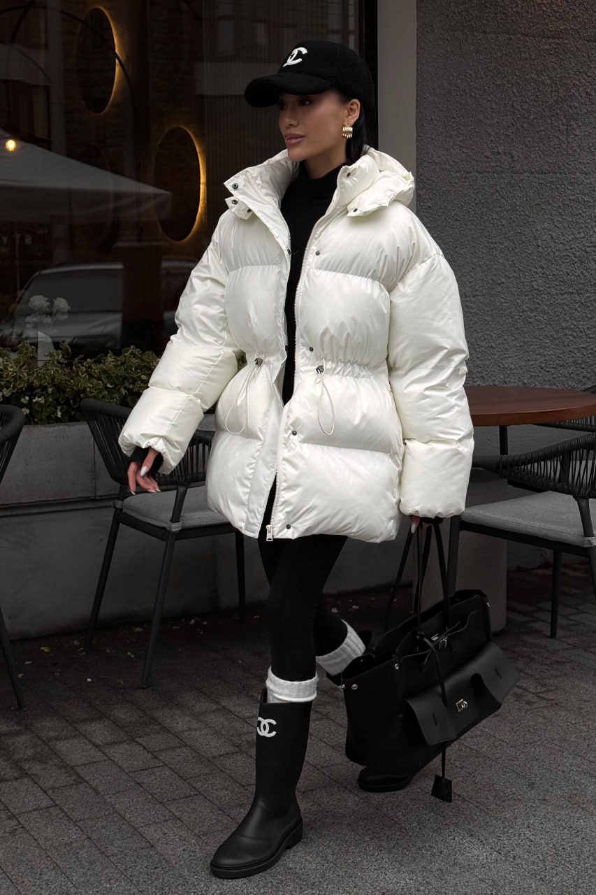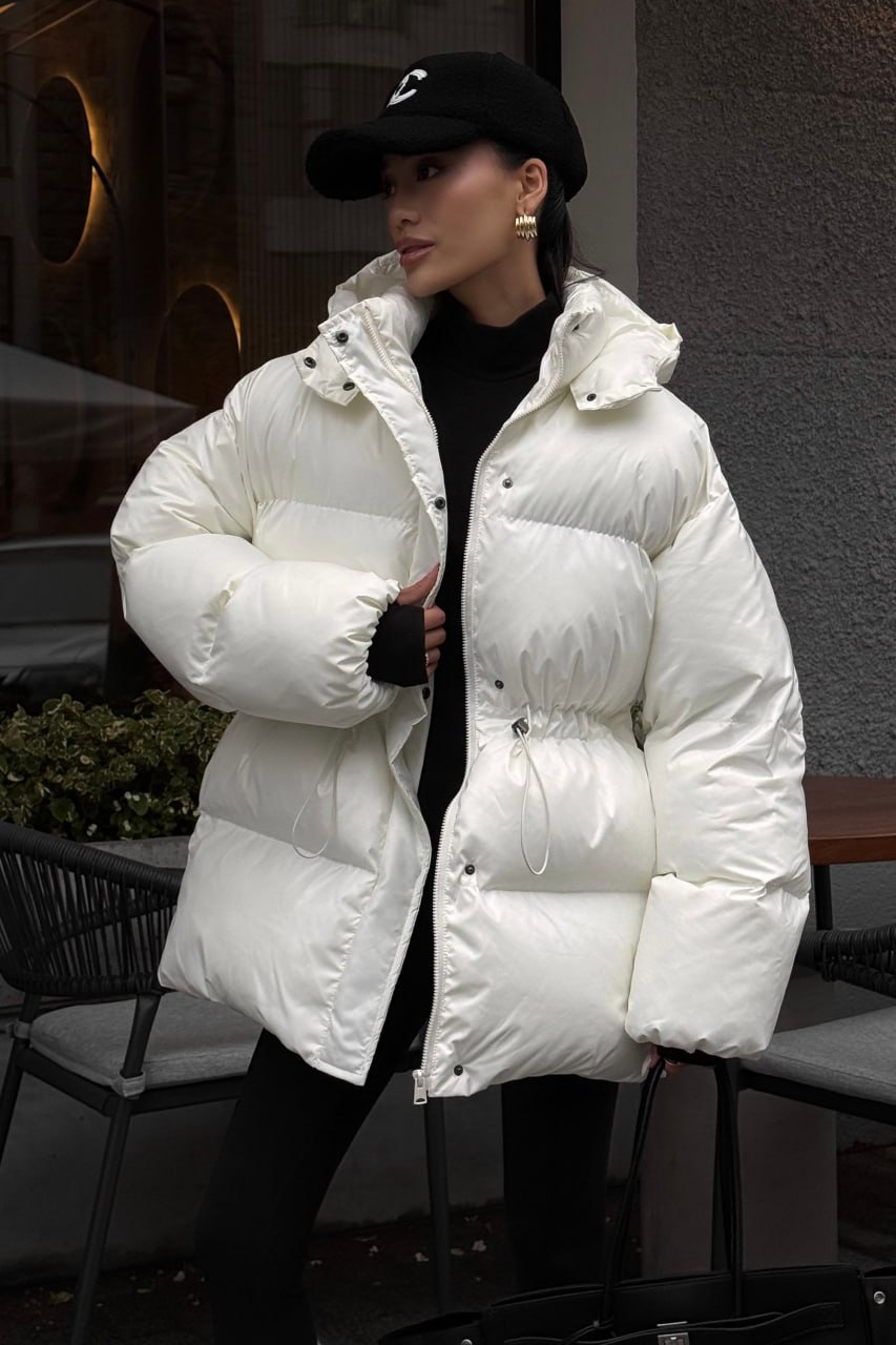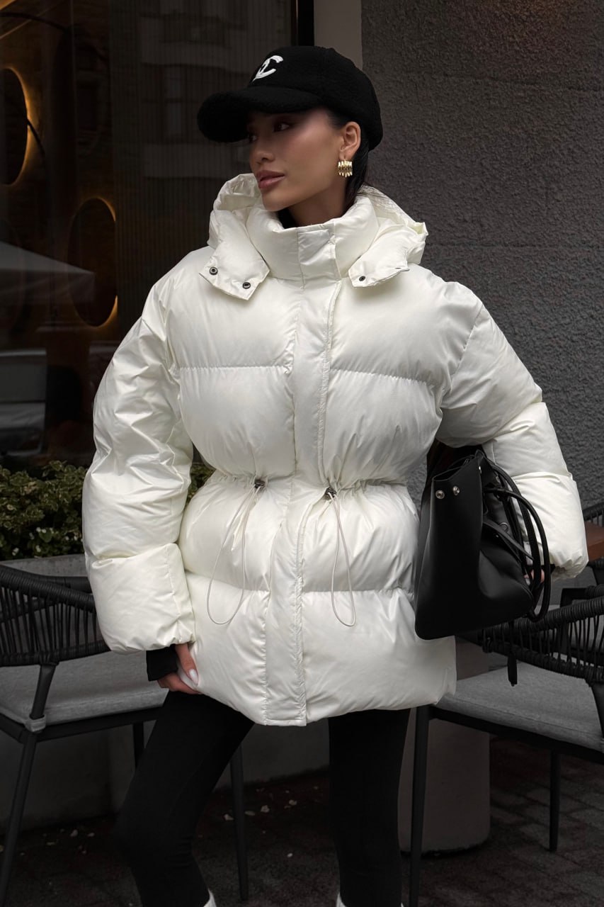 Женская Зимняя Объемная Молочная Куртка Пуховик Айс с Капюшоном и Затяжками на Талии