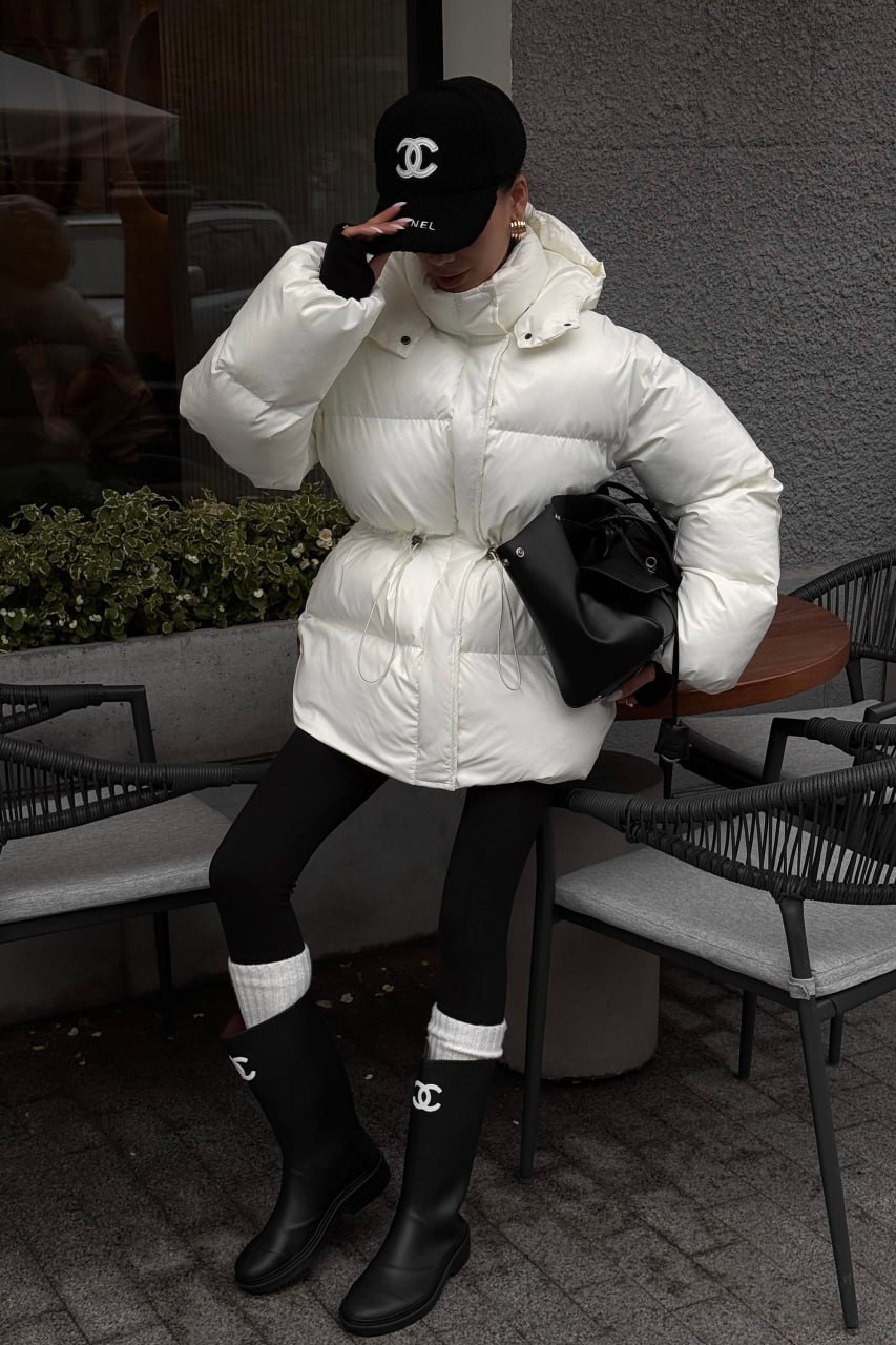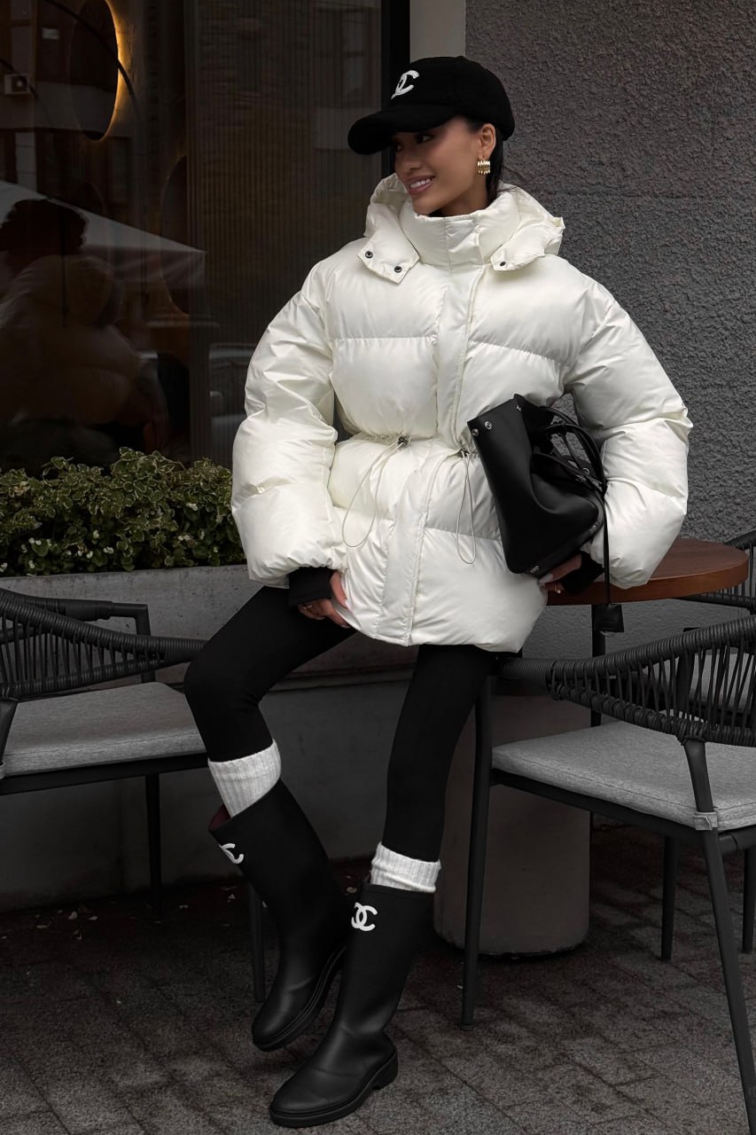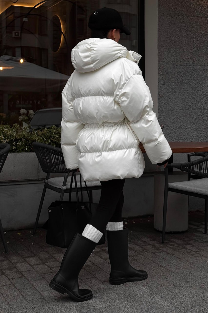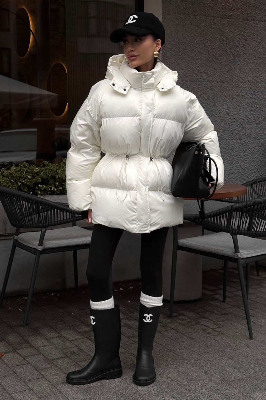 Женская Зимняя Объемная Молочная Куртка Пуховик Айс с Капюшоном и Затяжками на Талии