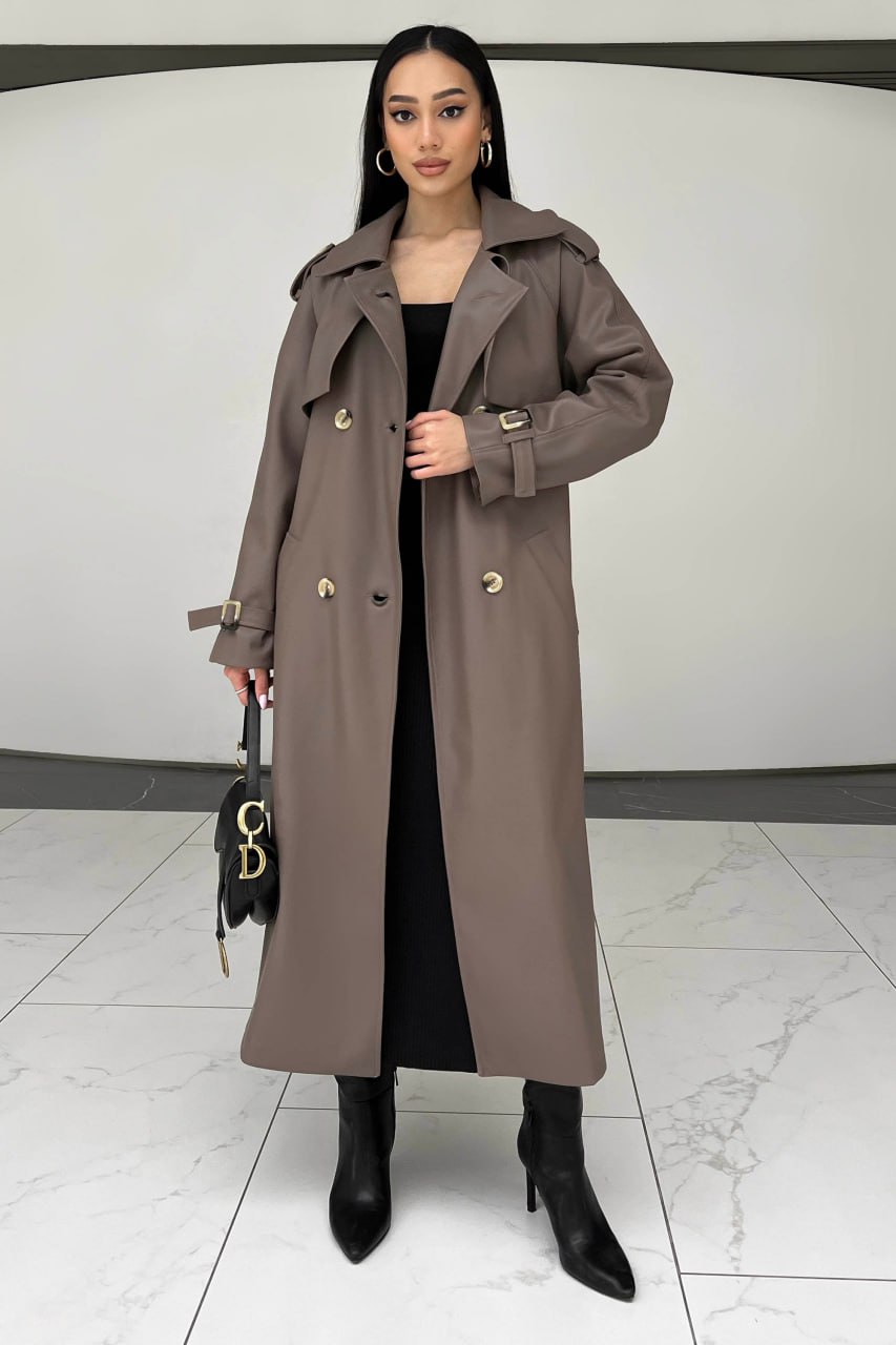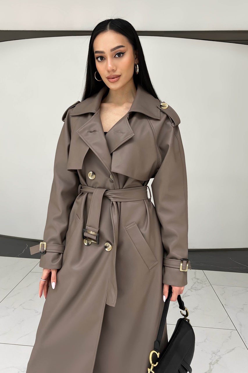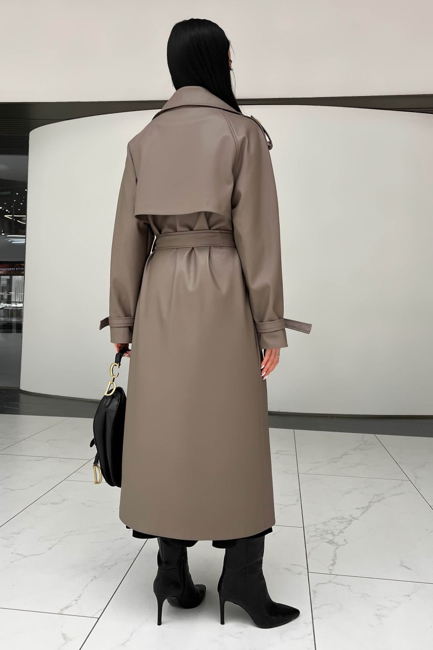 Женский Кожаный Тренч Некст Цвета Мокко – Удлиненный Макси с Поясом и Пуговицами в Два Ряда