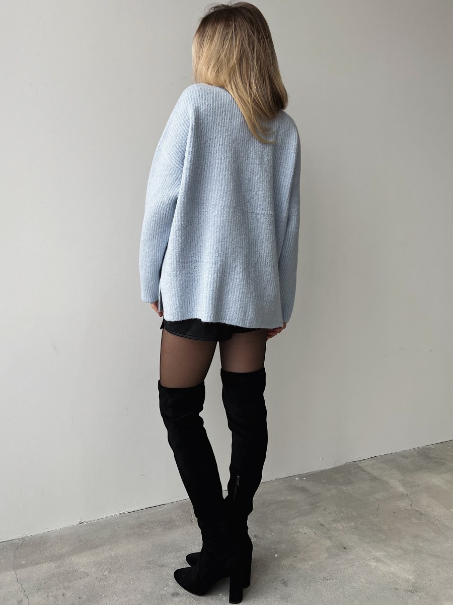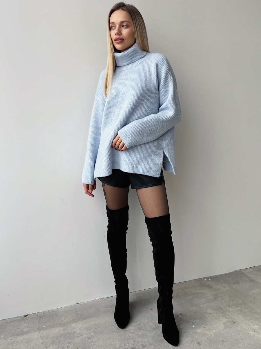 Женский Кашемировый Голубой Свитер – Объемный с Высоким Горлом и Разрезами по Бокам