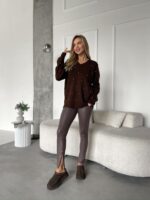 Женский Коричневый Свитер Оверсайз в Ромбах с Камушками Стразами