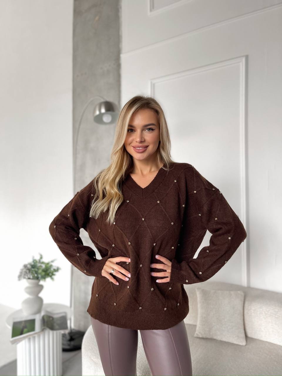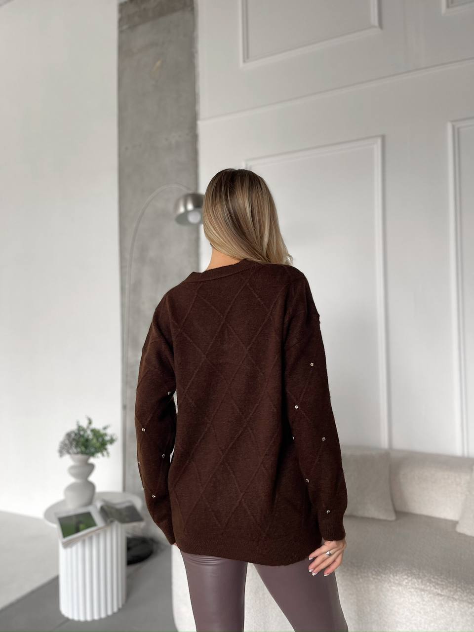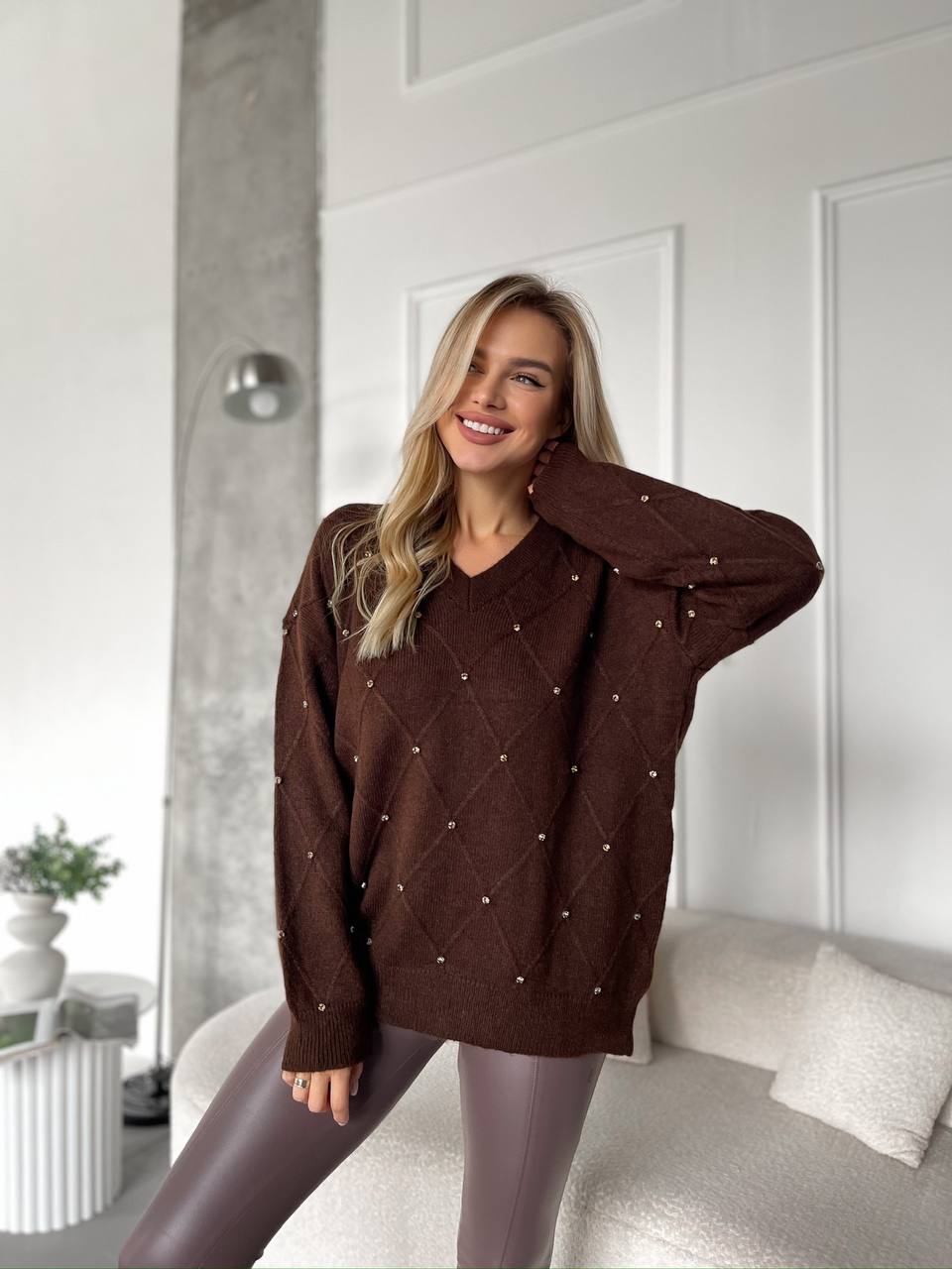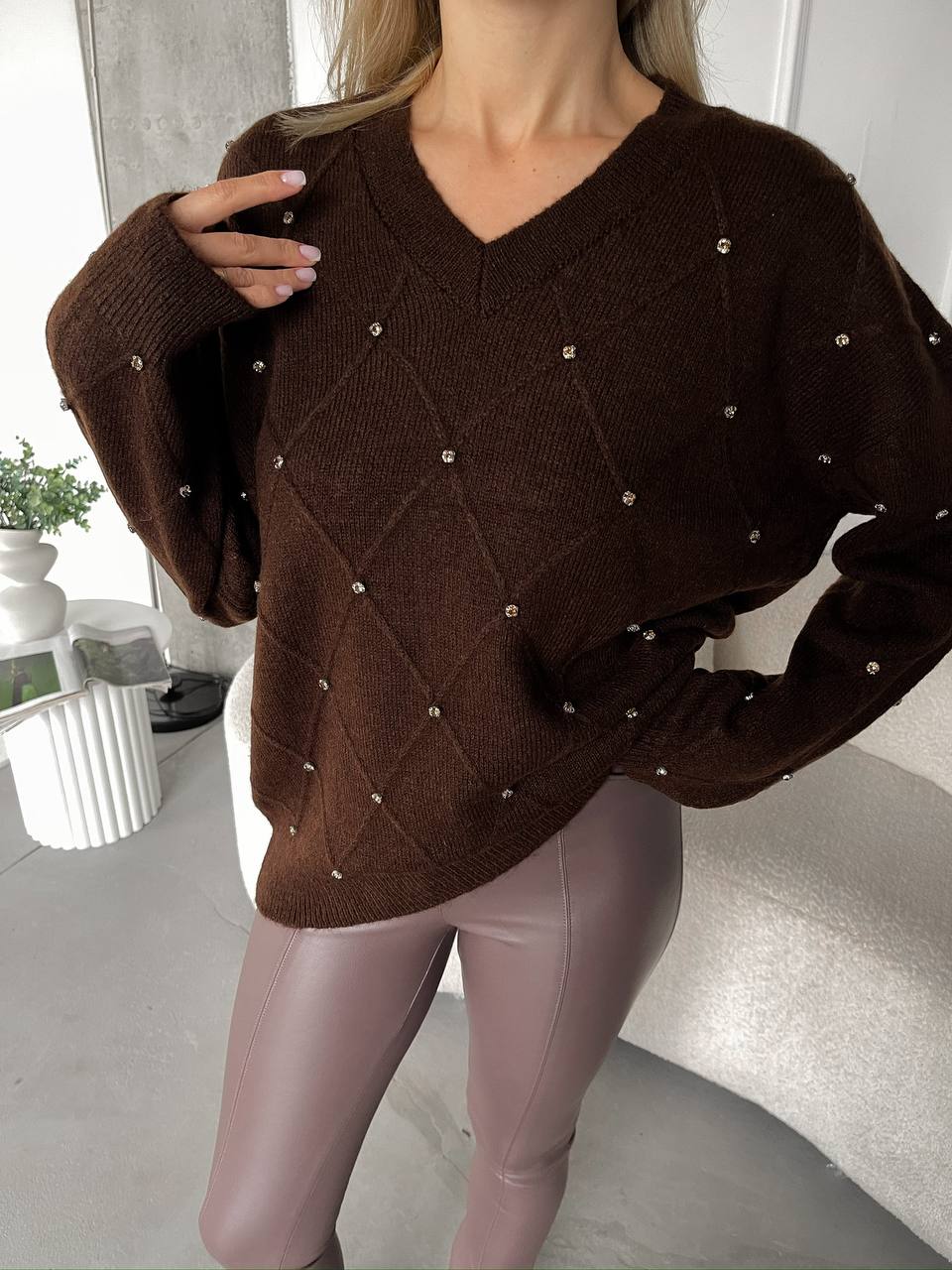 Женский Коричневый Свитер Оверсайз в Ромбах с Камушками Стразами