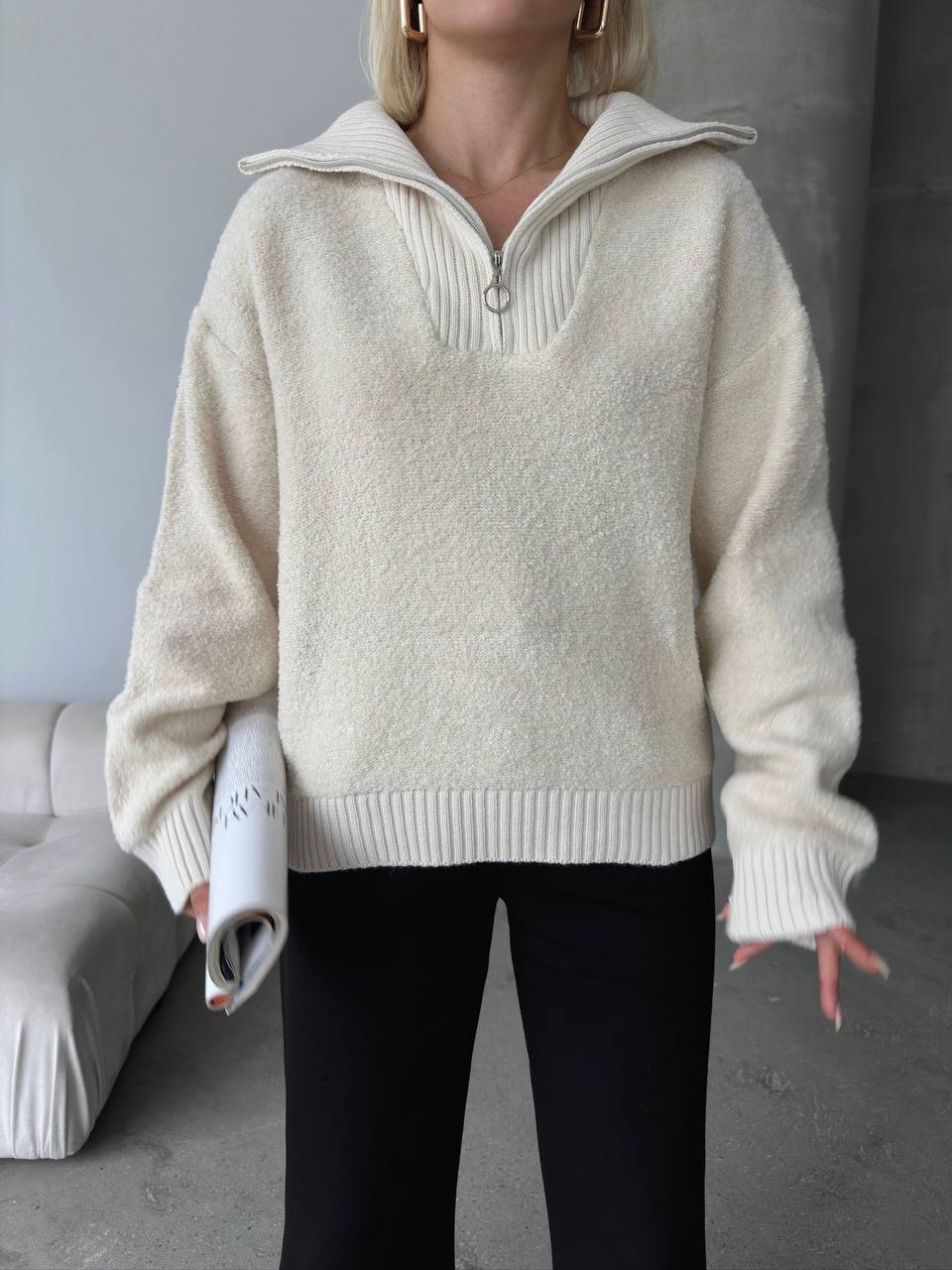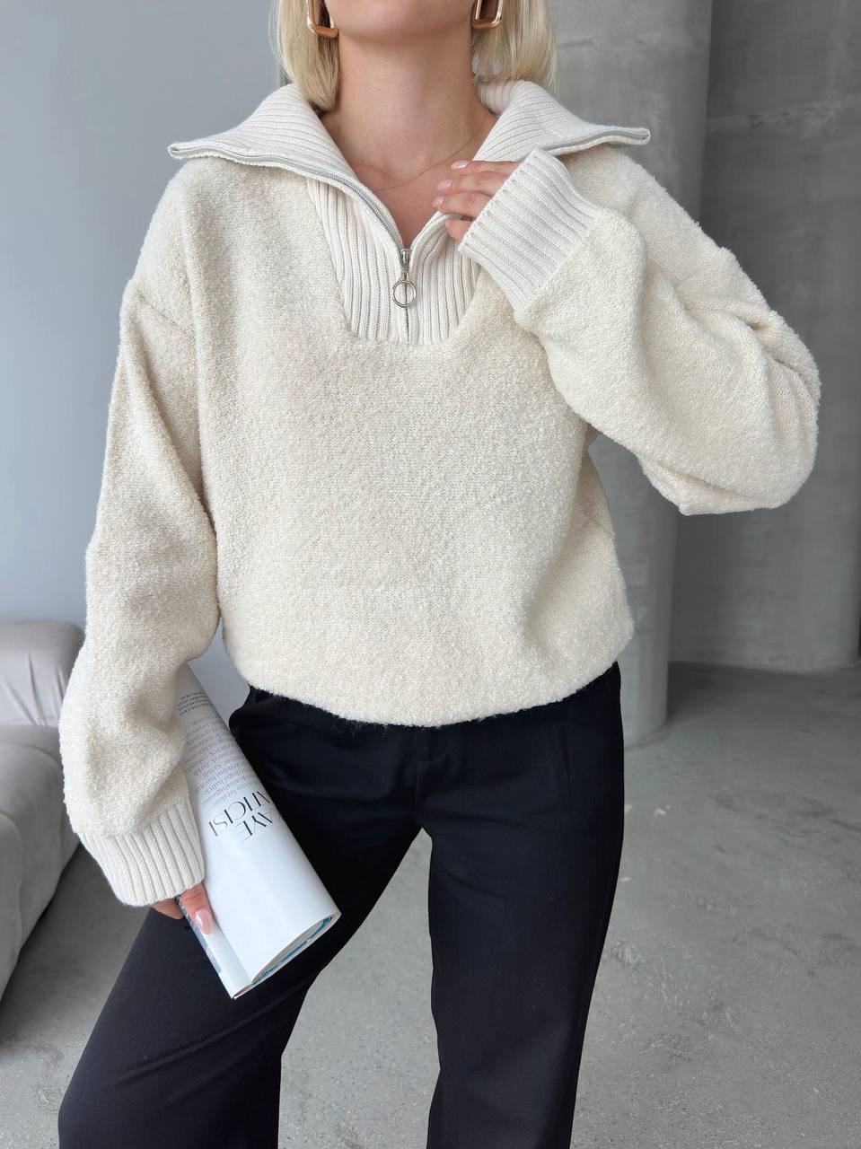 Женский Кучерявый Молочный Свитер Букле с Зип Воротником на Змейке
