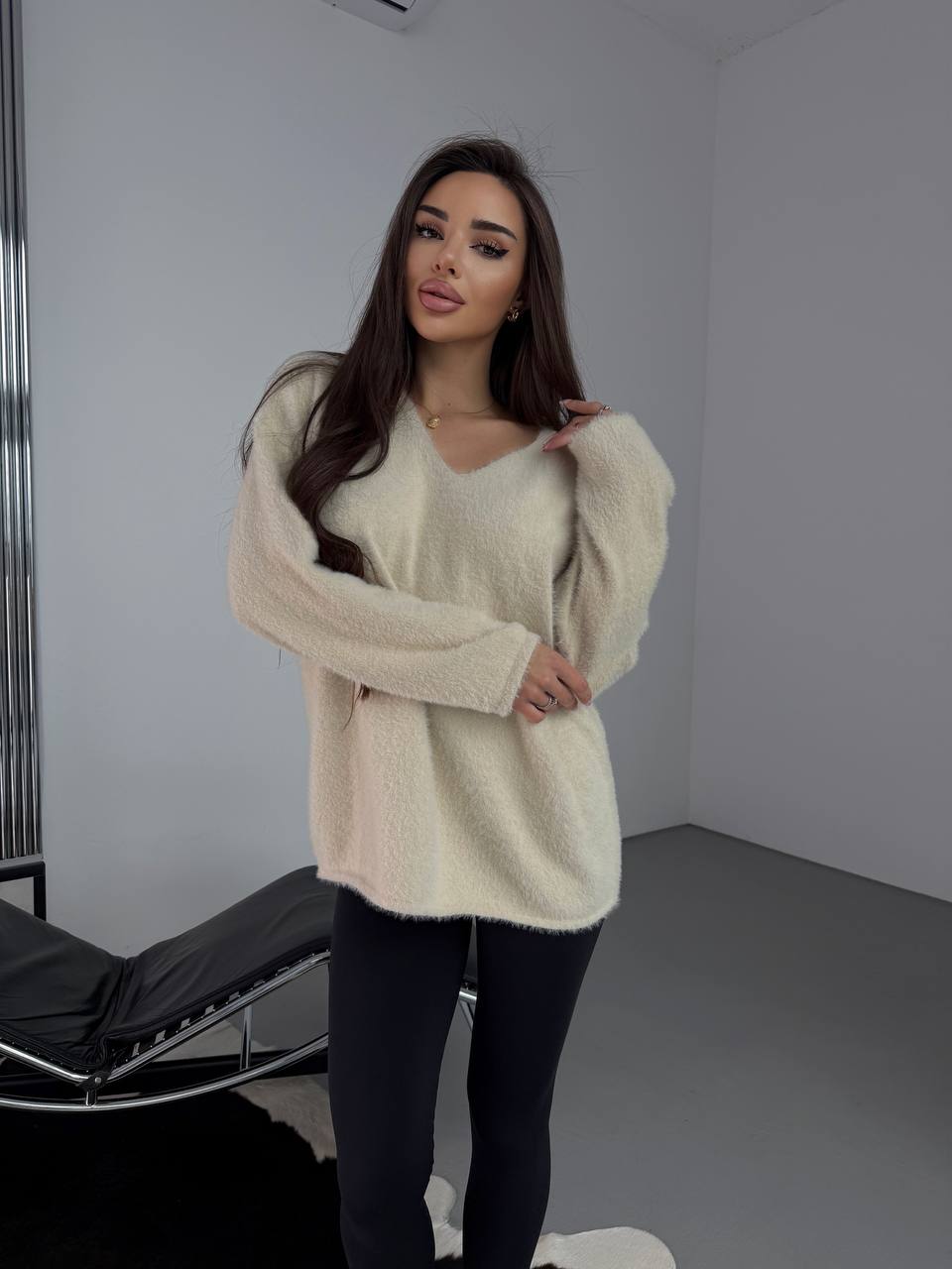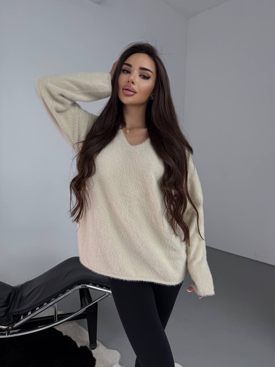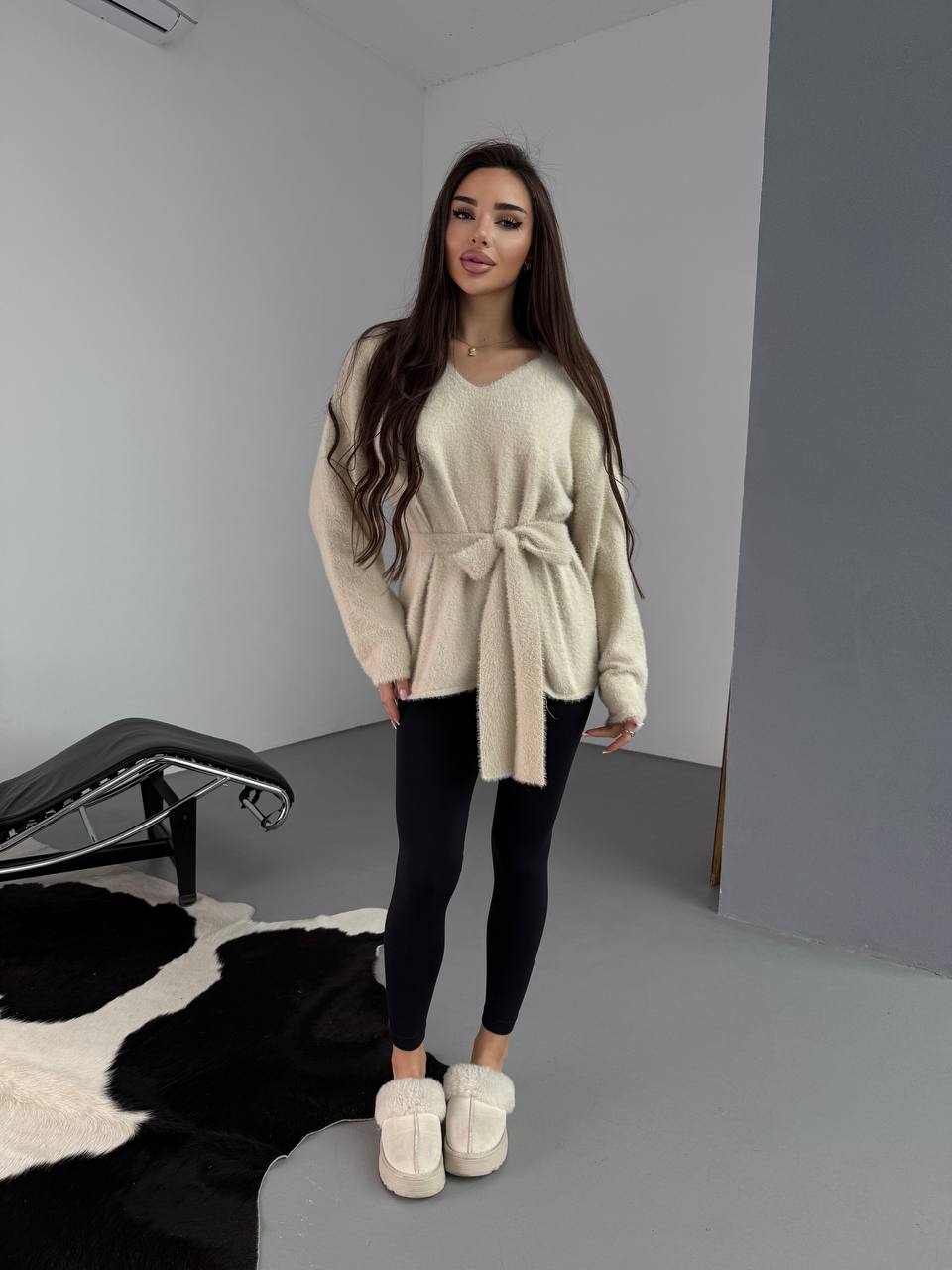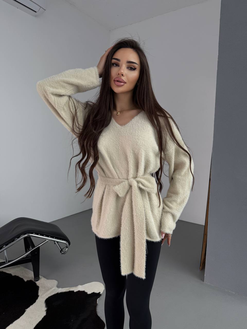 Женский Пушистый Бежевый Свитер Оверсайз с V-вырезом и Поясом