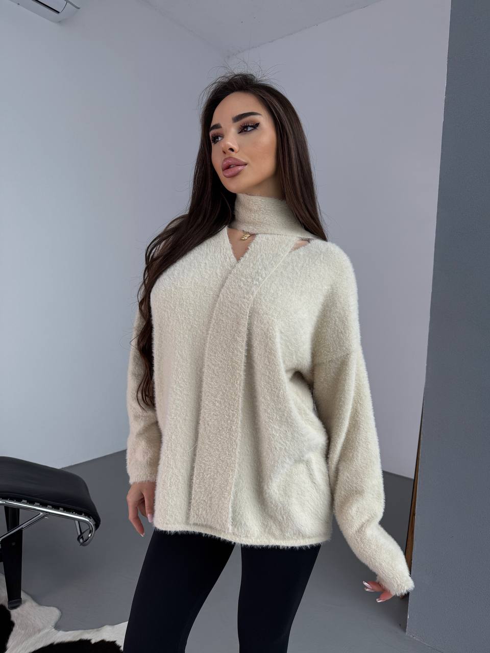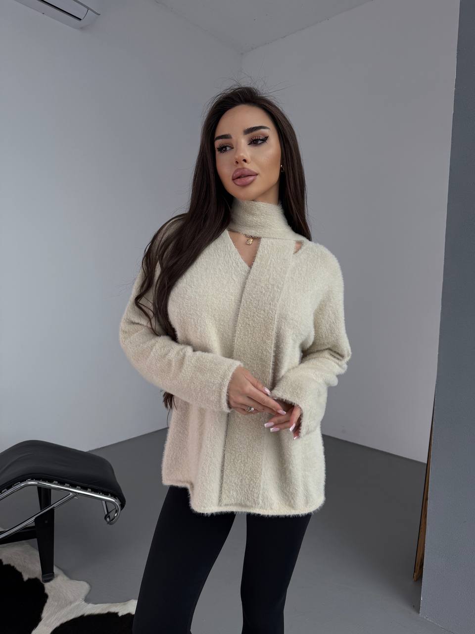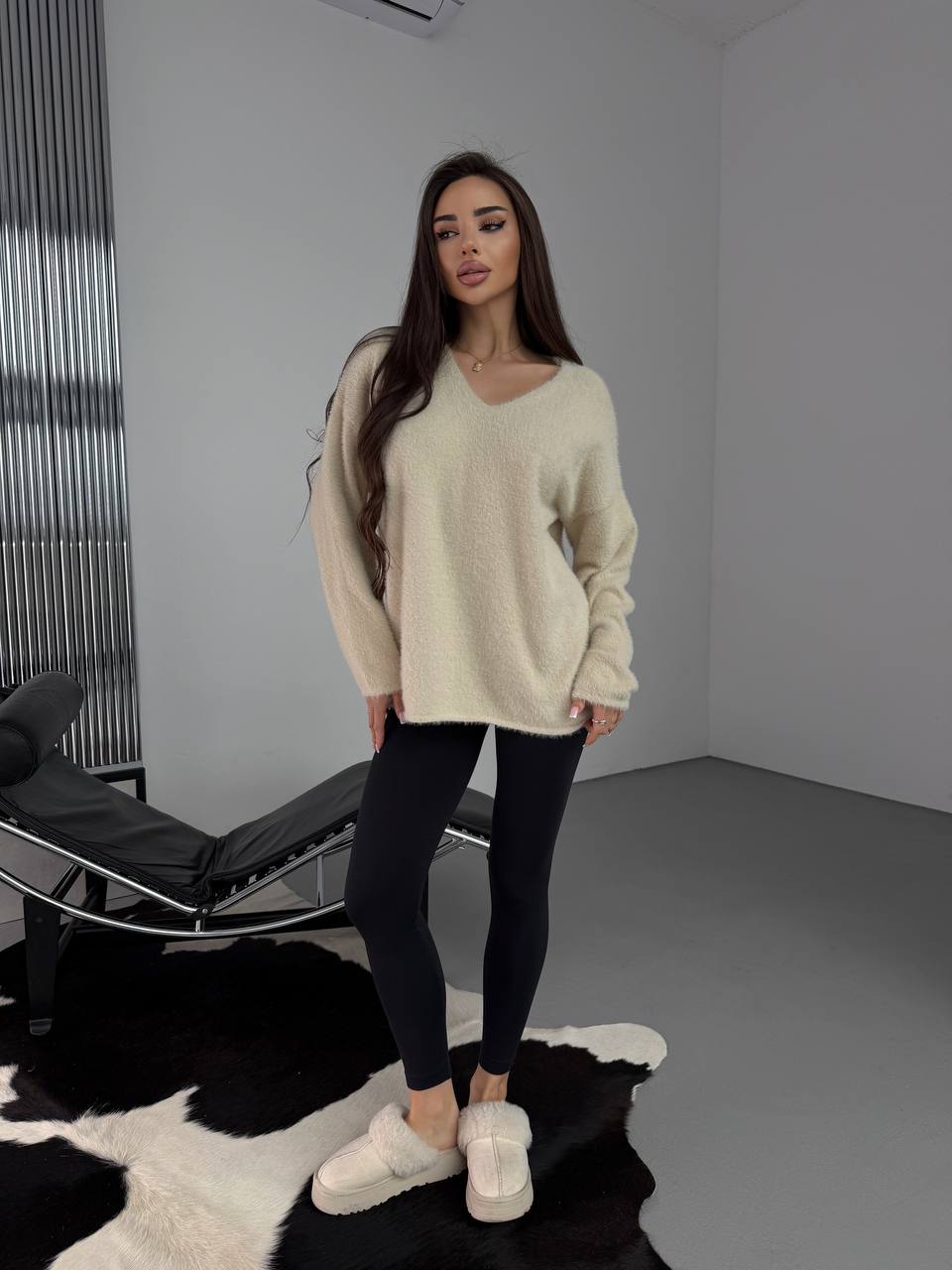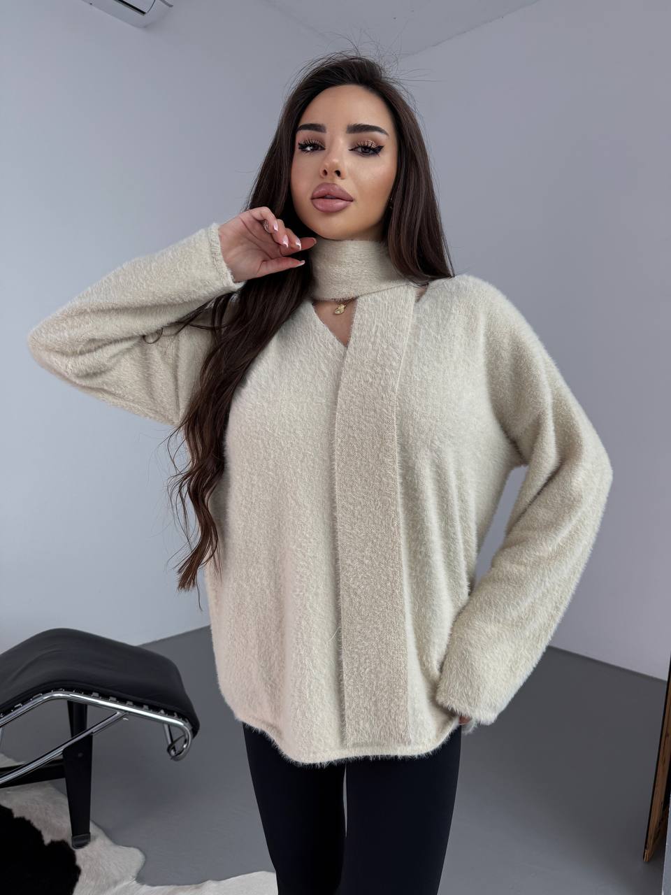 Женский Пушистый Бежевый Свитер Оверсайз с V-вырезом и Поясом