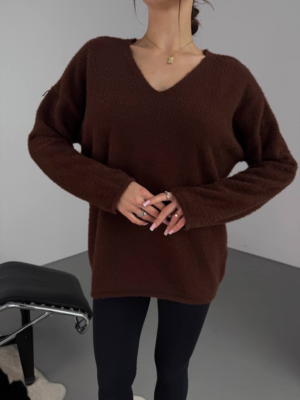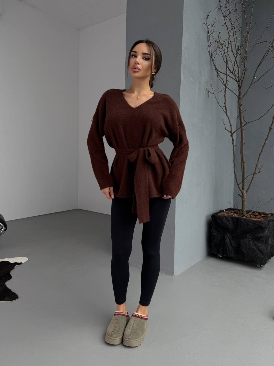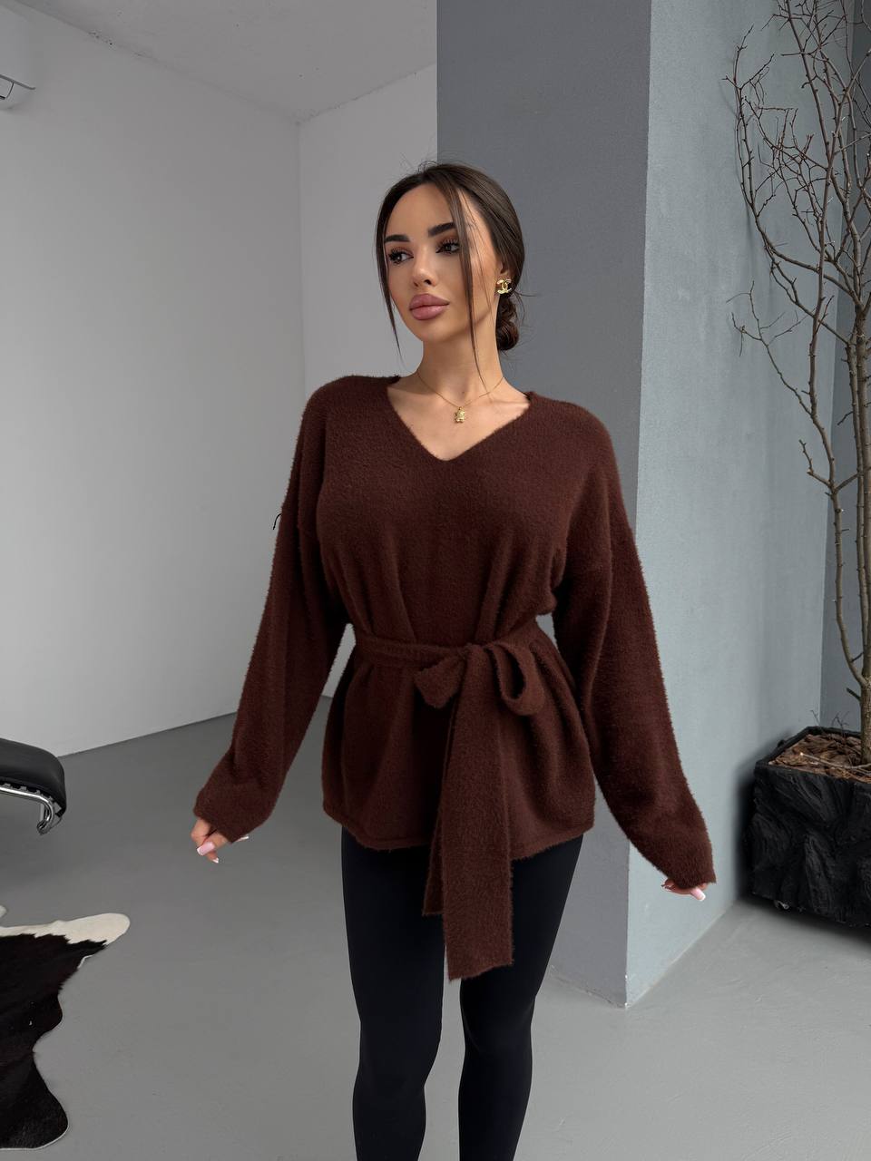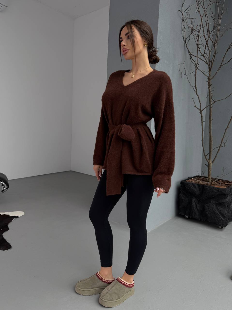 Женский Пушистый Коричневый Свитер Оверсайз с V-вырезом и Поясом