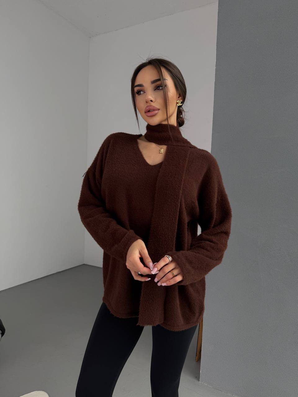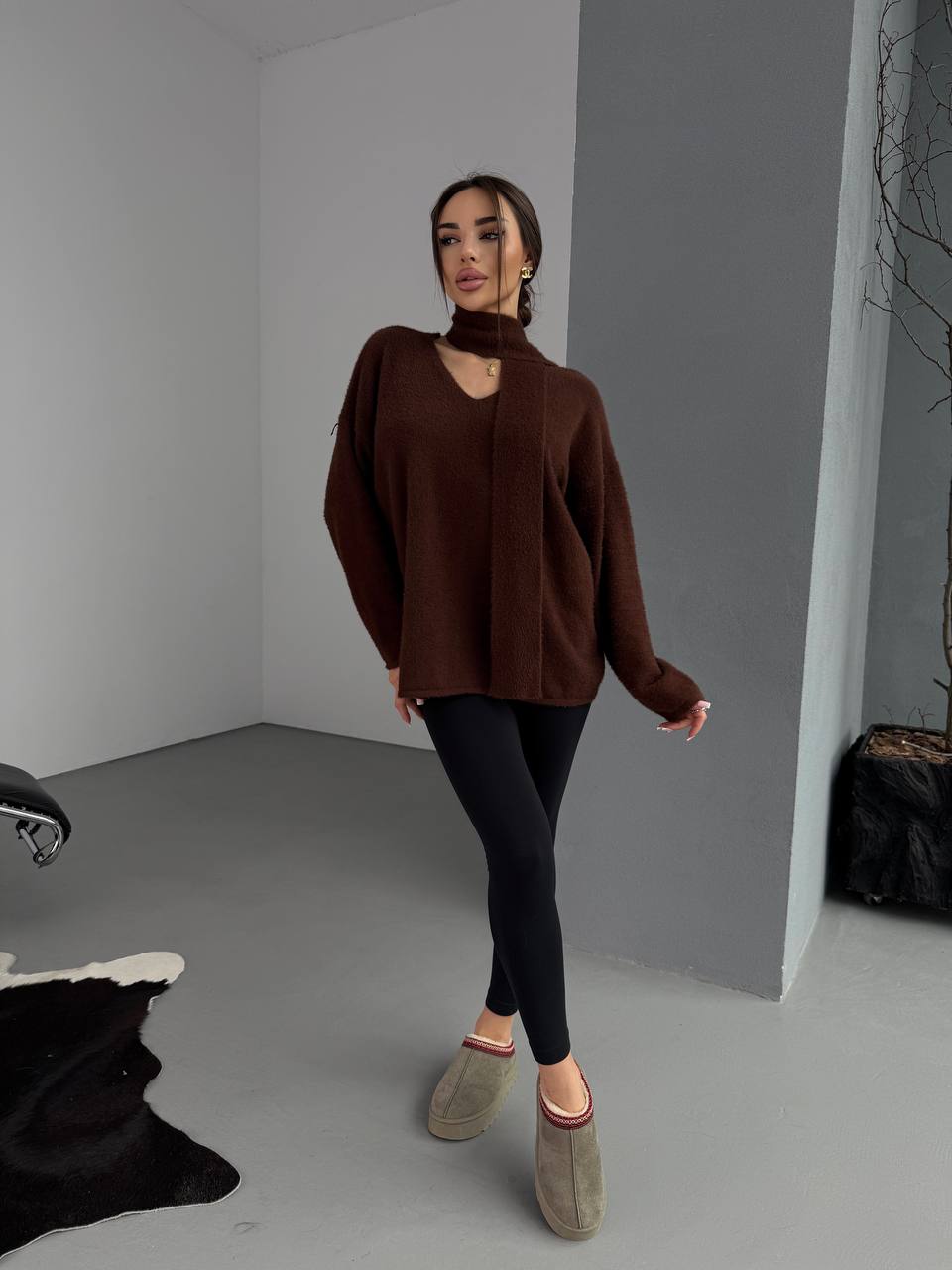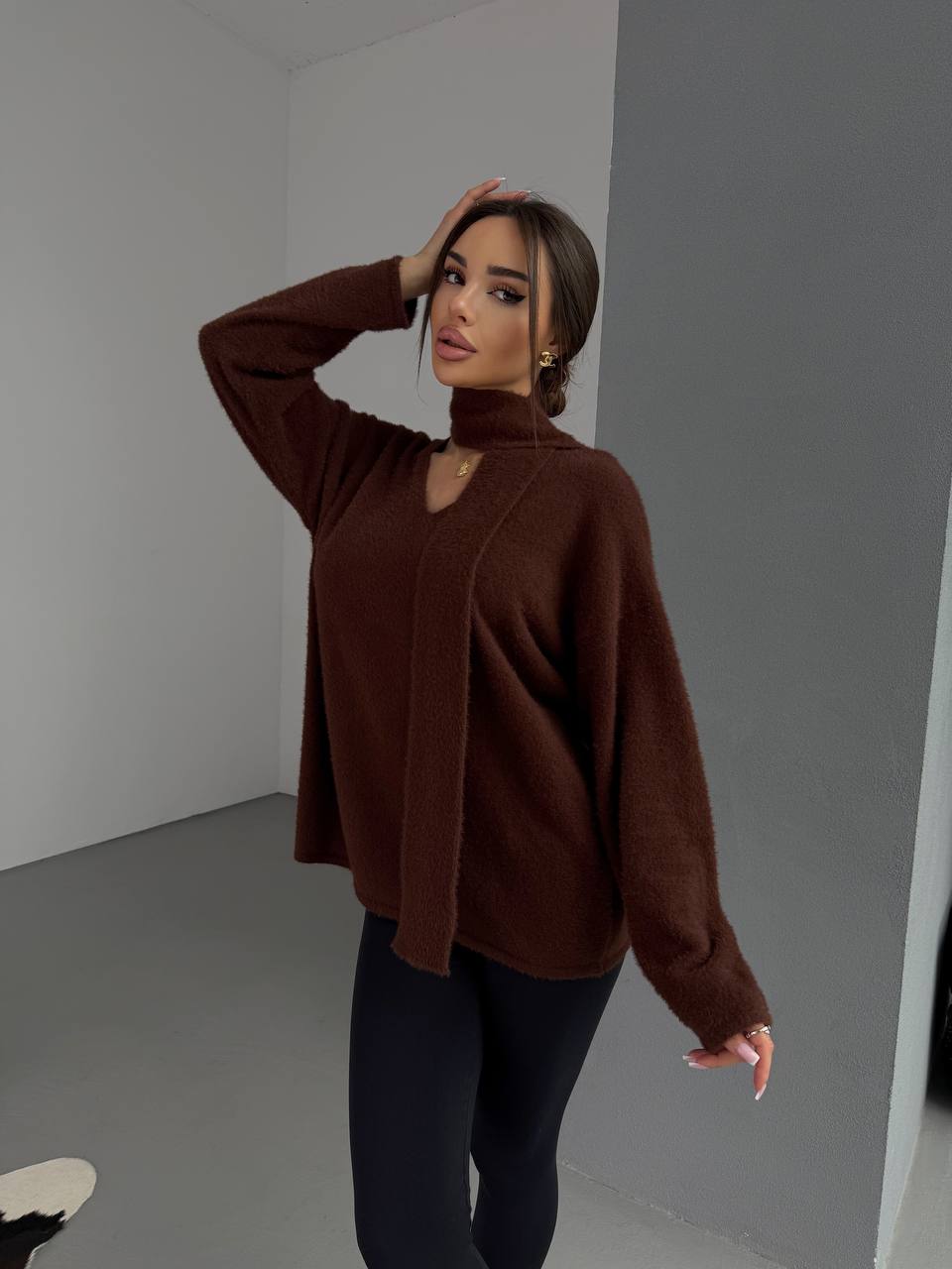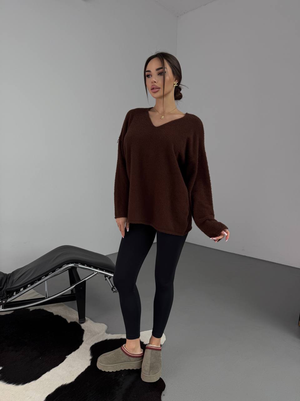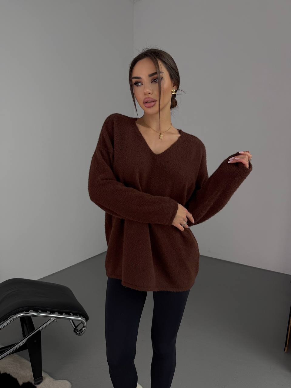 Женский Пушистый Коричневый Свитер Оверсайз с V-вырезом и Поясом