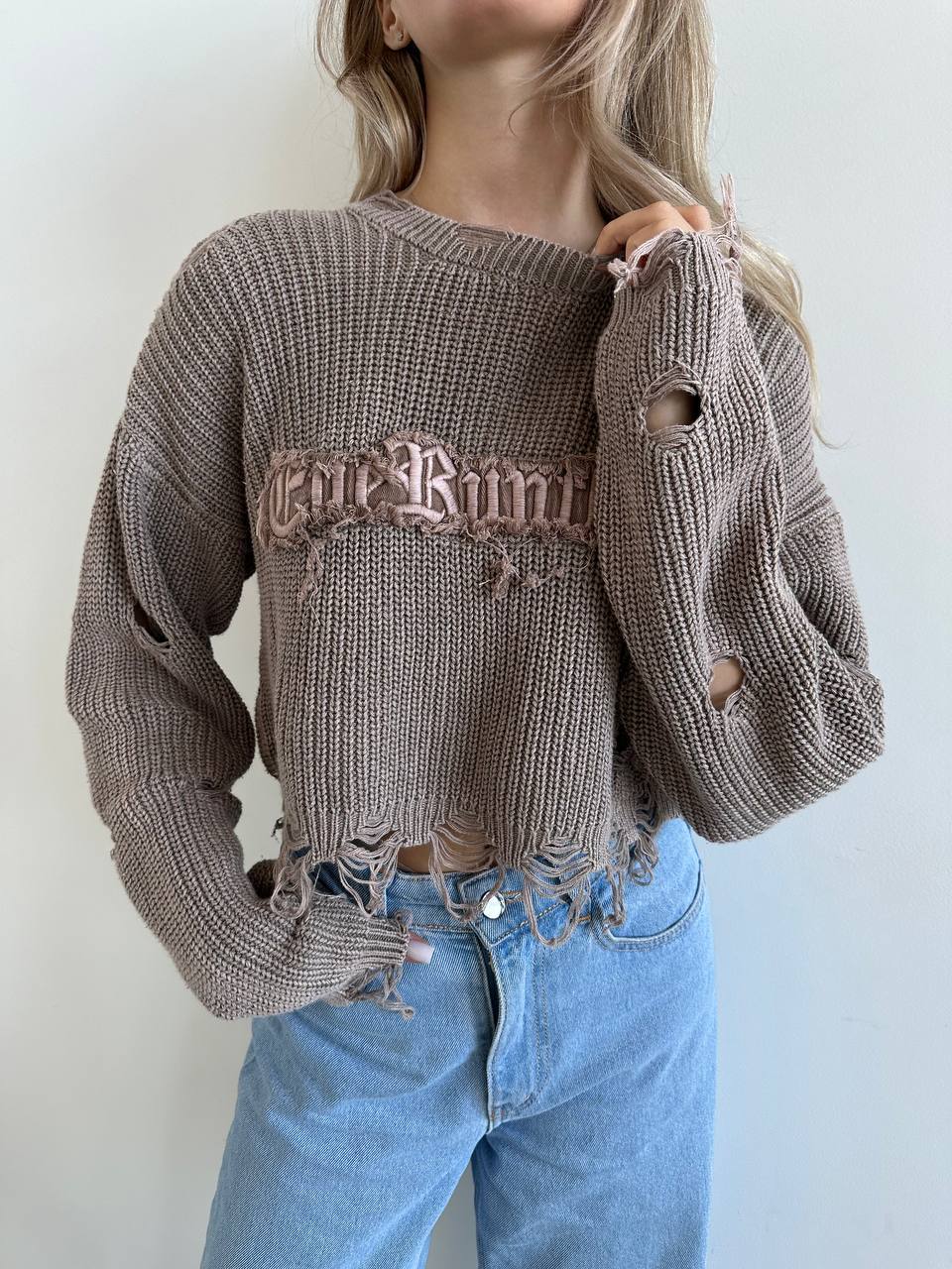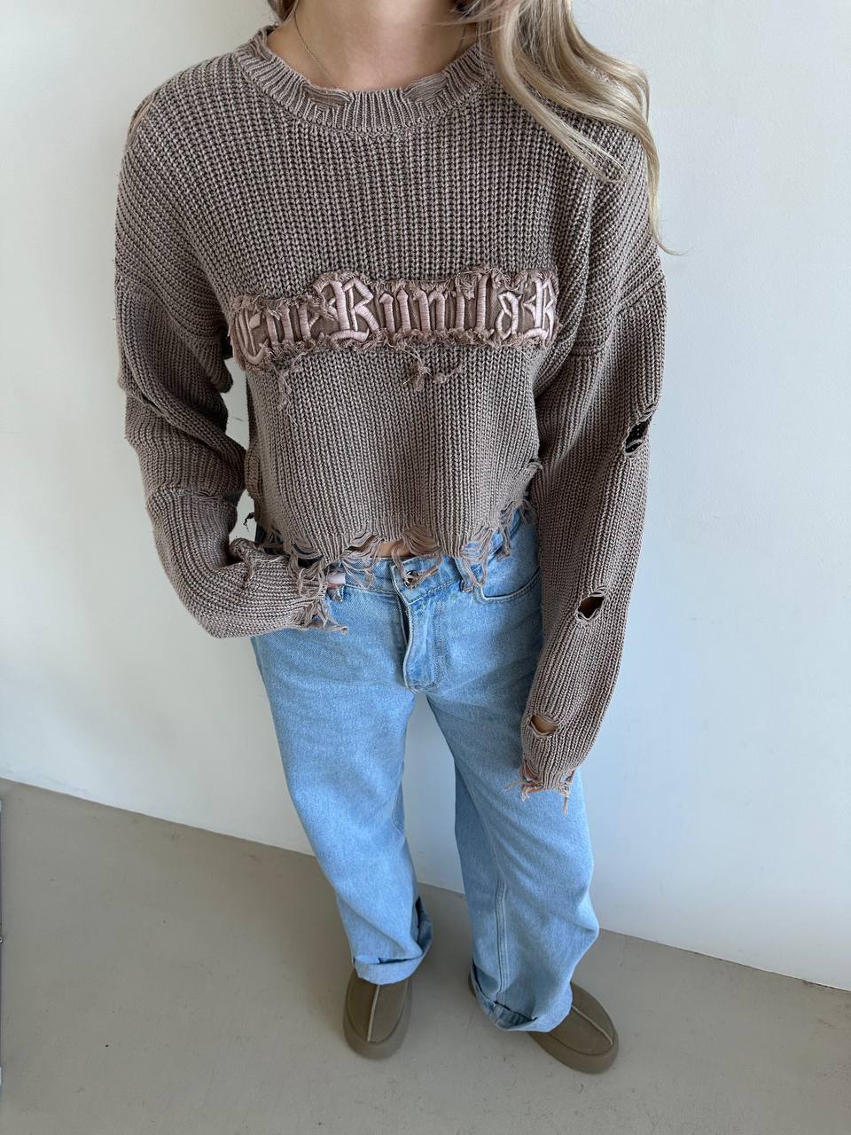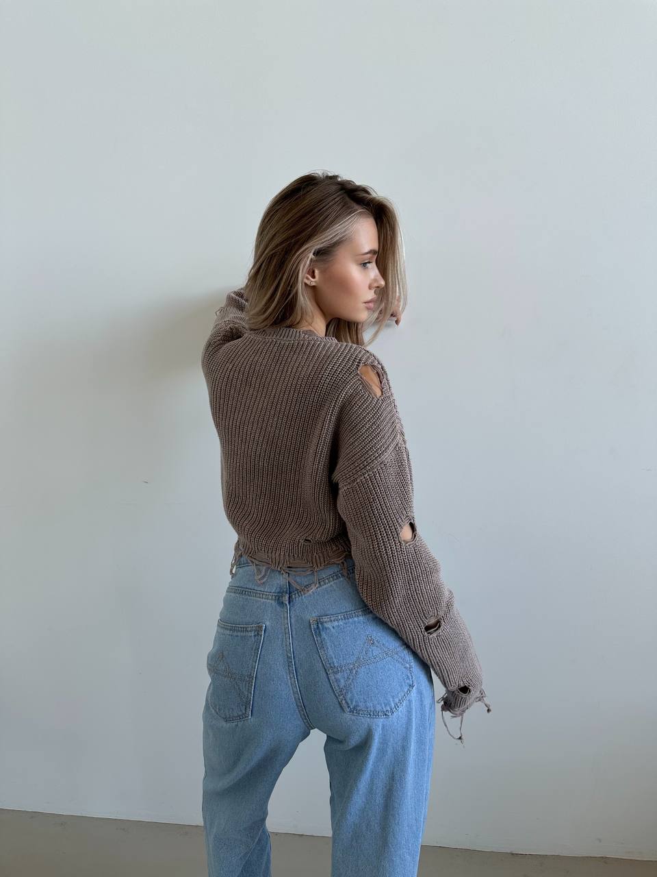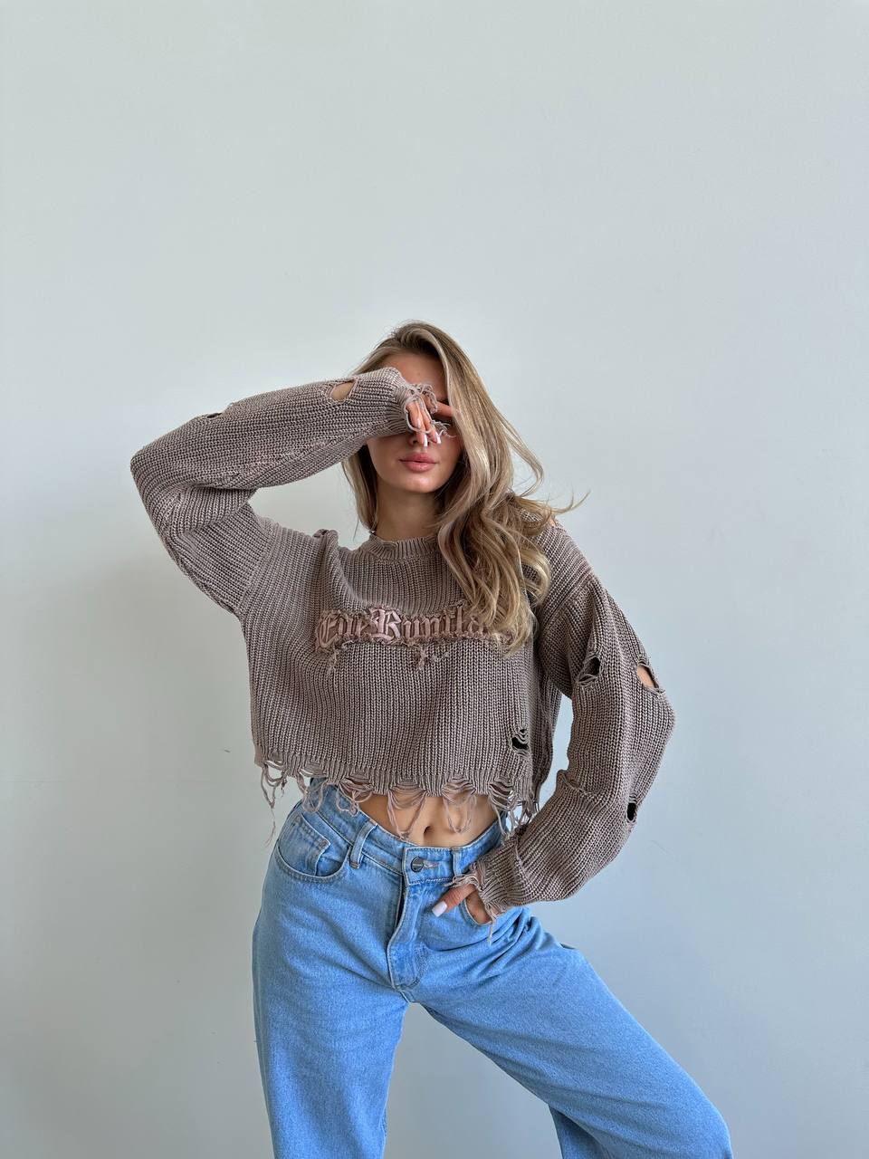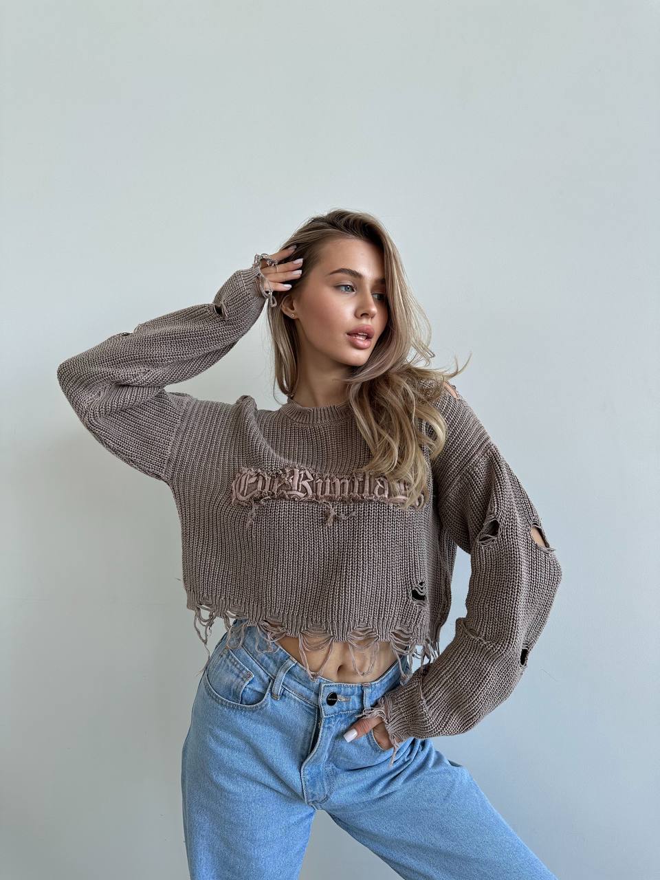 Женский Свитер Мокко Варенка – Укороченный Вязаный Рваный с Нашивкой Вышивкой