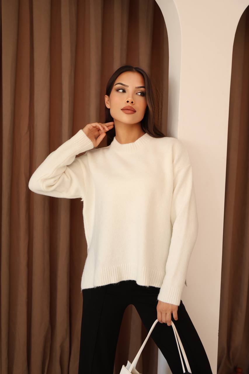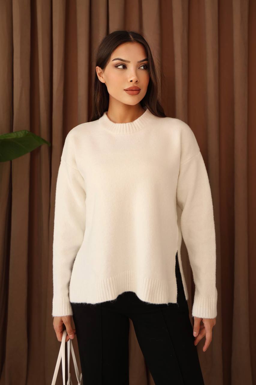 Женский Теплый Базовый Белый Свитер Оверсайз с Разрезами по Бокам
