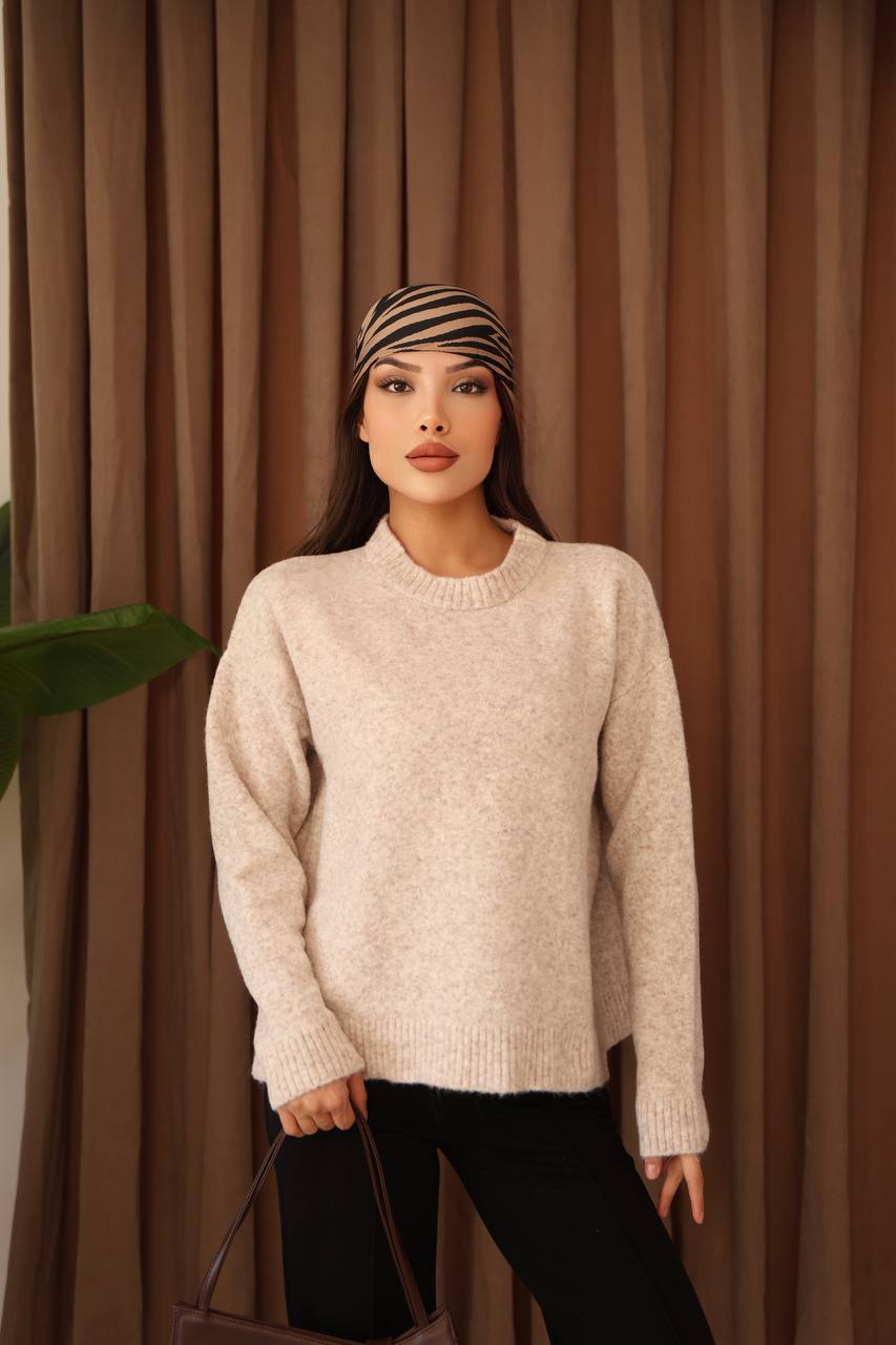 Женский Теплый Базовый Бежевый Свитер Оверсайз с Разрезами по Бокам