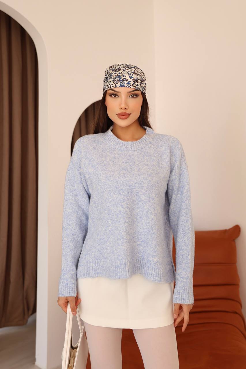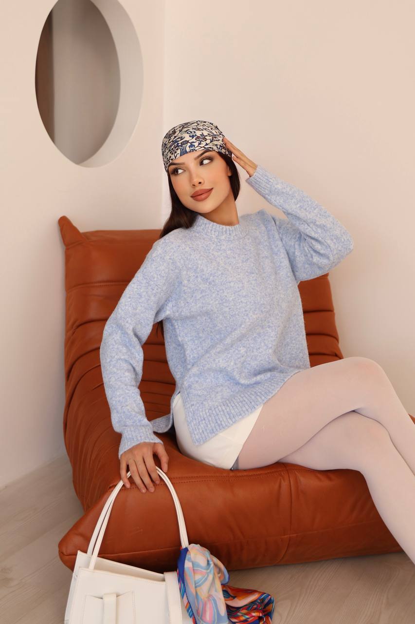 Женский Теплый Базовый Голубой Свитер Оверсайз с Разрезами по Бокам
