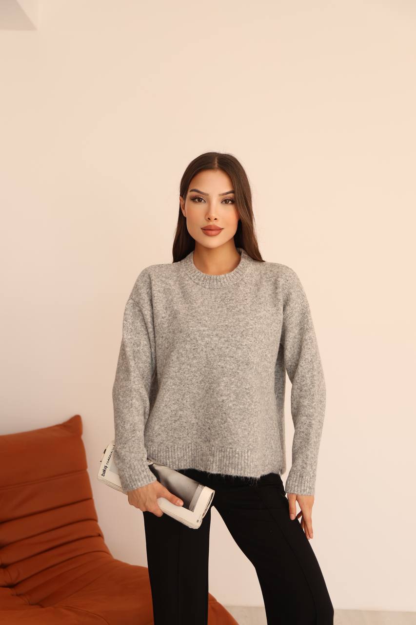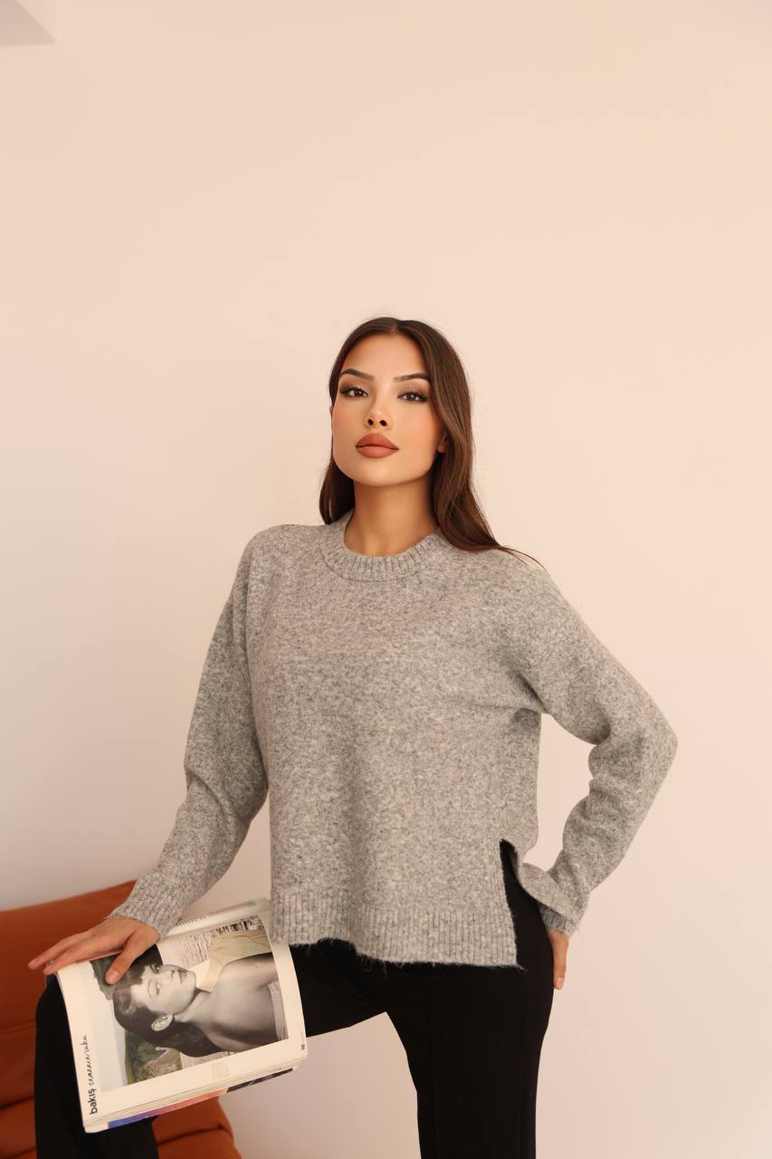 Женский Теплый Базовый Серый Свитер Оверсайз с Разрезами по Бокам