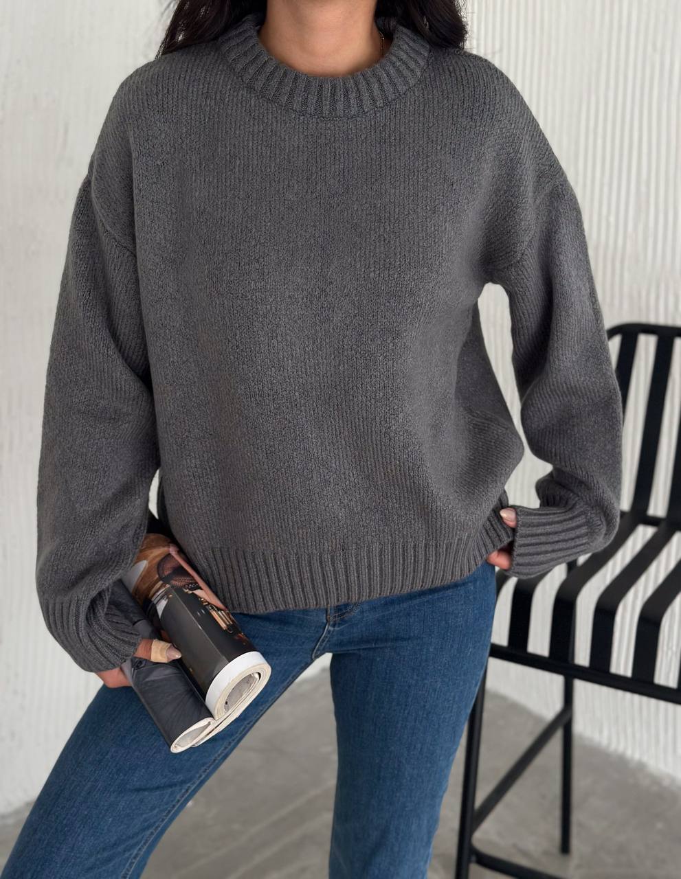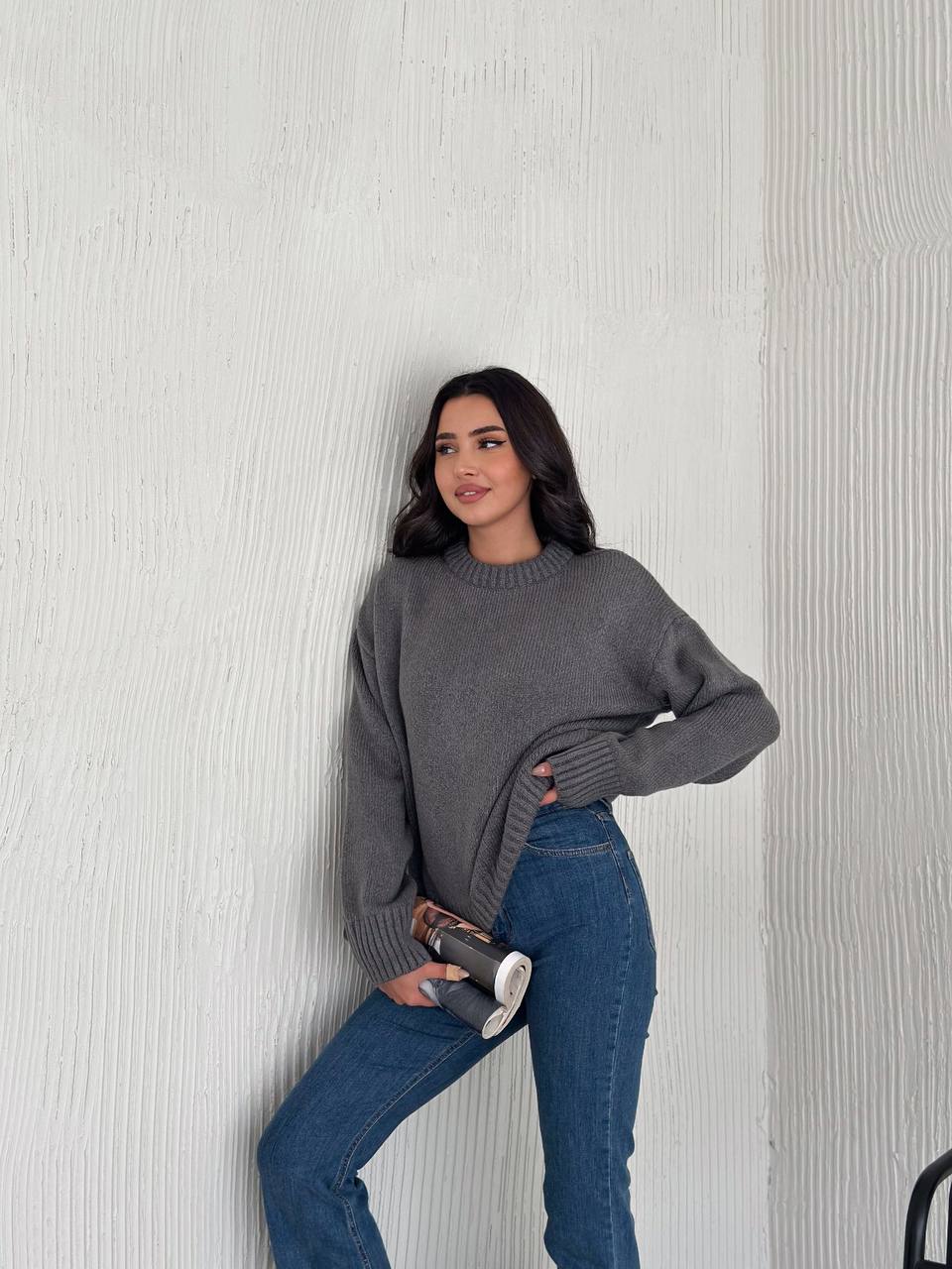 Женский Теплый Мягкий Графитовый Свитер Оверсайз – Трикотажный с Заниженной Линией Плеча
