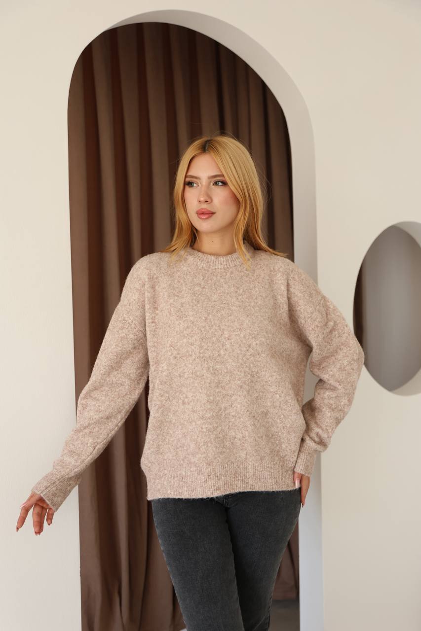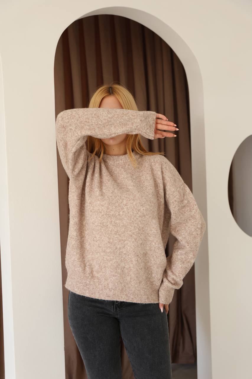 Женский Теплый Свитер Мокко Свободного Кроя с Заниженной Линией Плеча