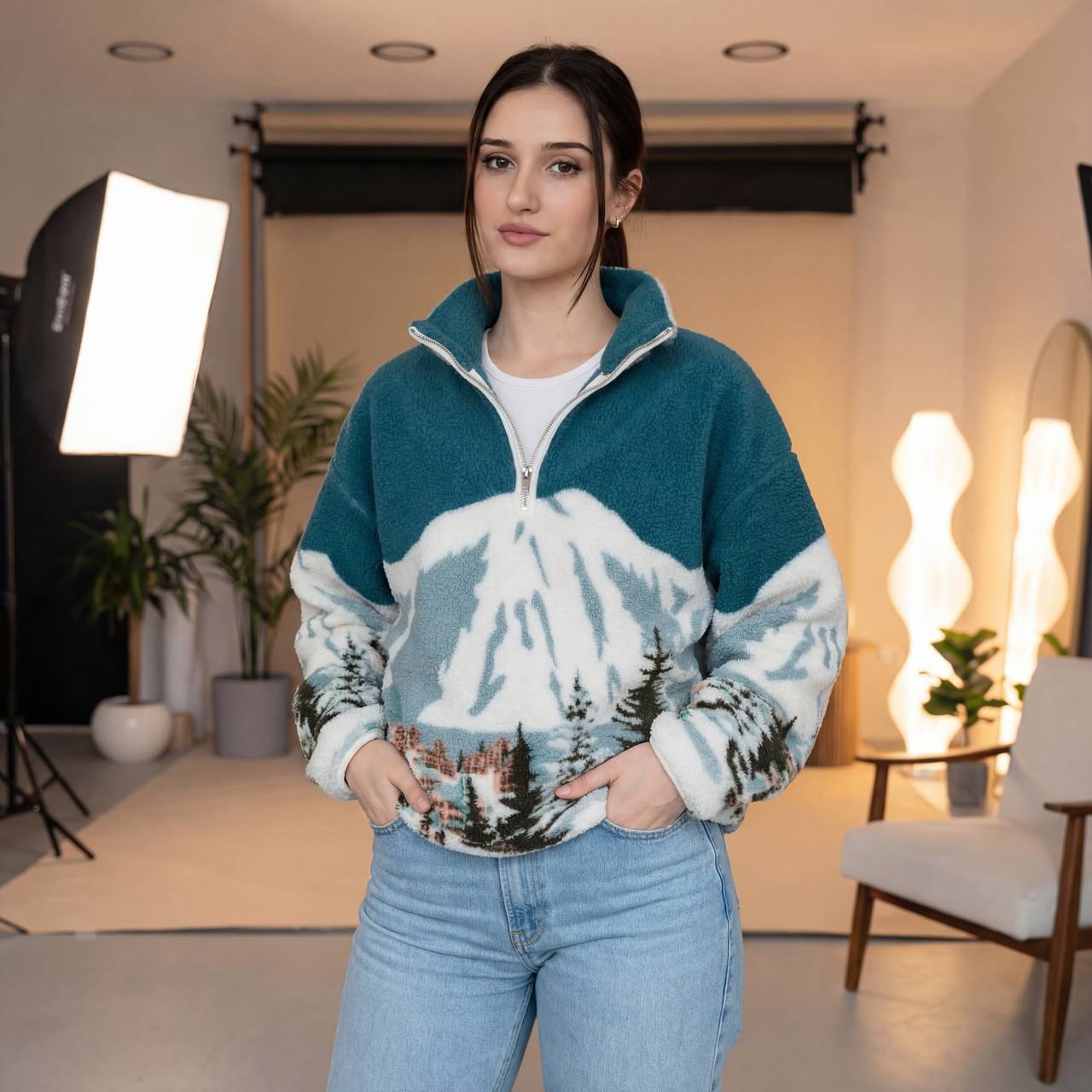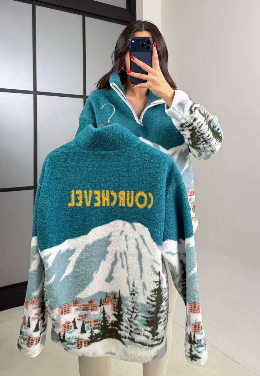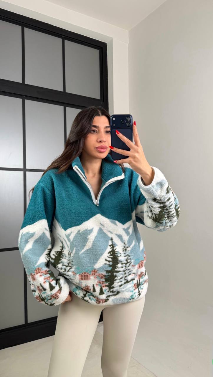 Женский Теплый Зеленый Свитер Оверсайз – Бомбер под Горло с Коротким Замком