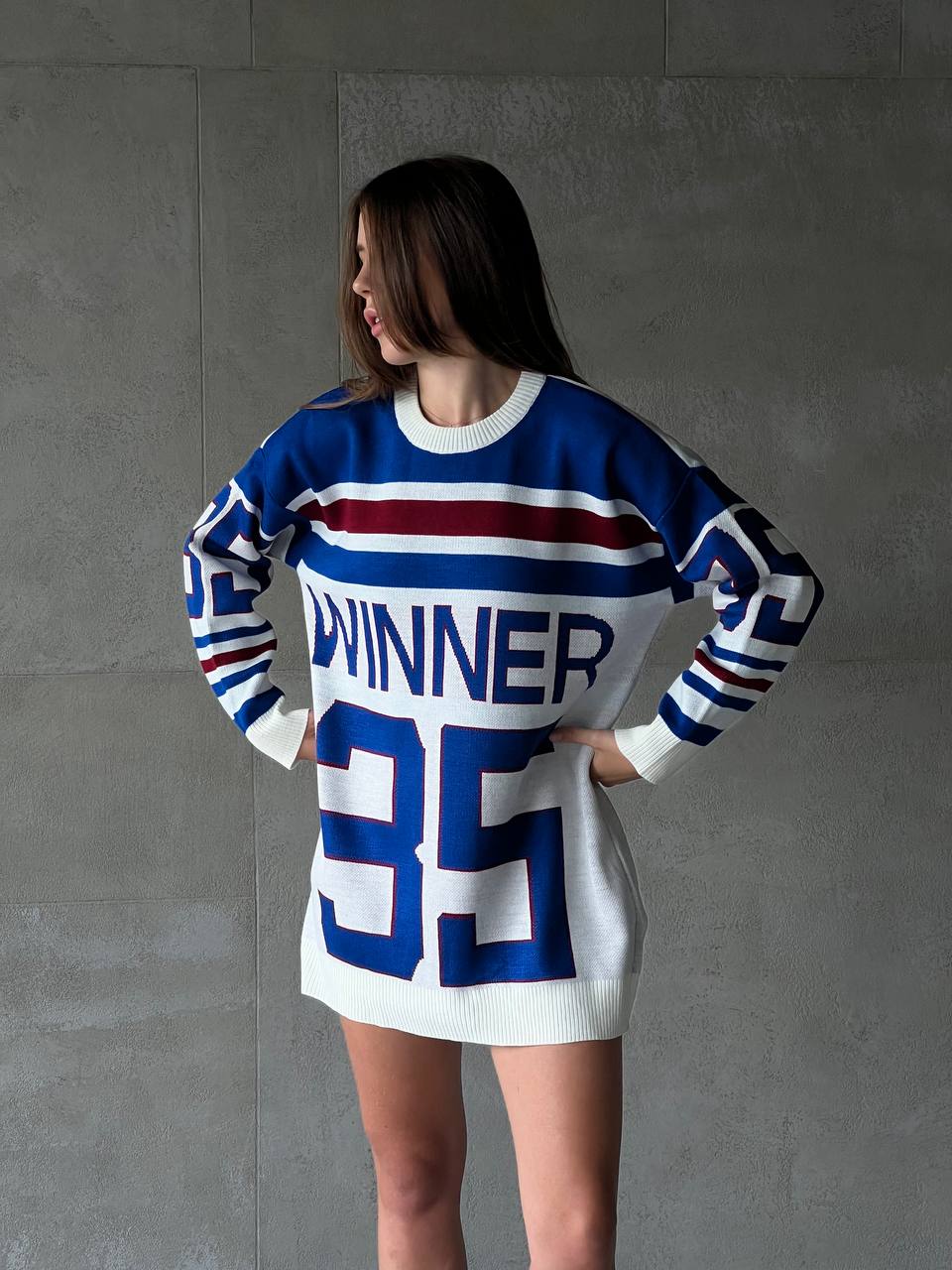 Женский Удлиненный Синий Свитер в Принт с Номером