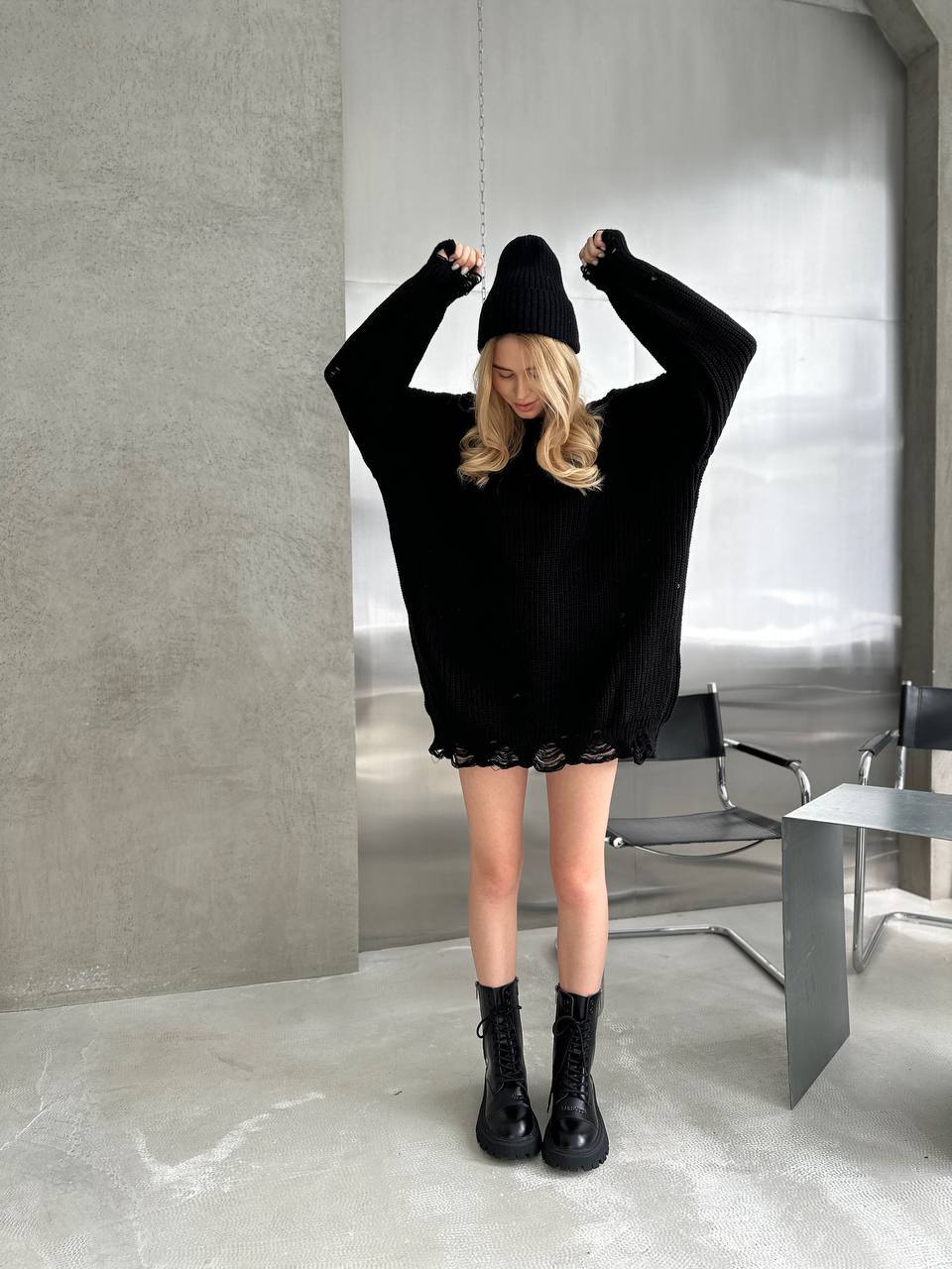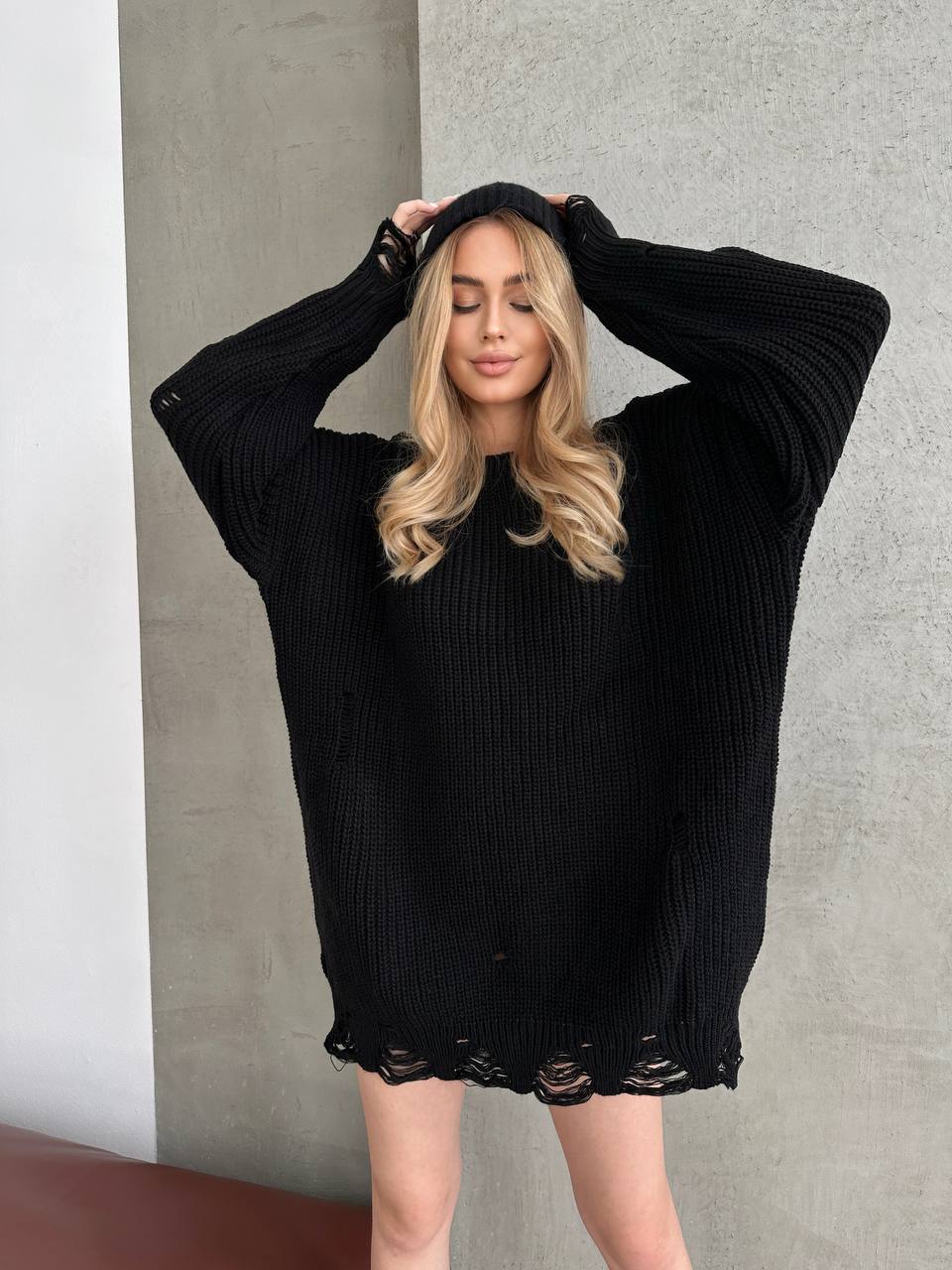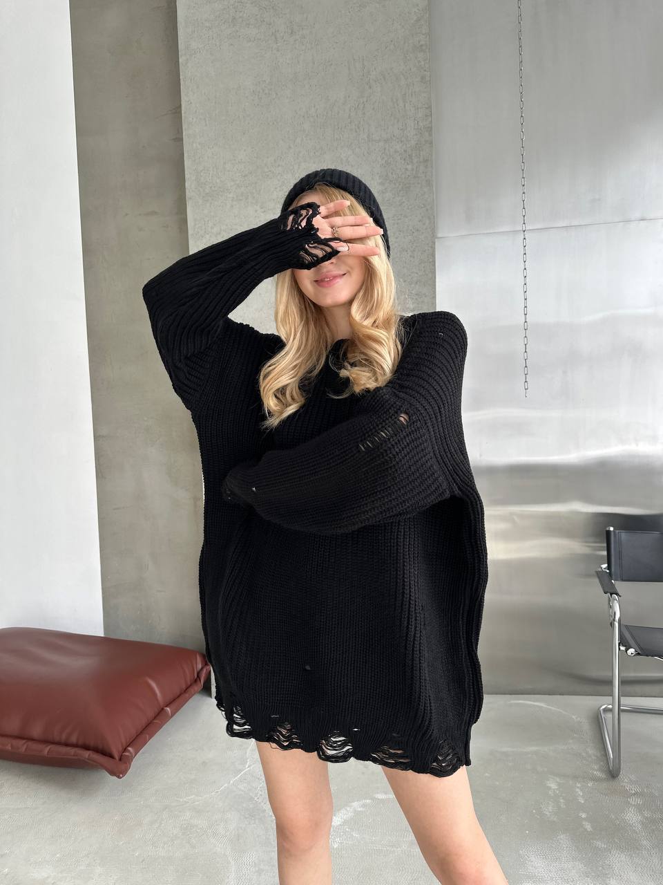 Женский Удлиненный Вязаный Черный Свитер Оверсайз Рваный