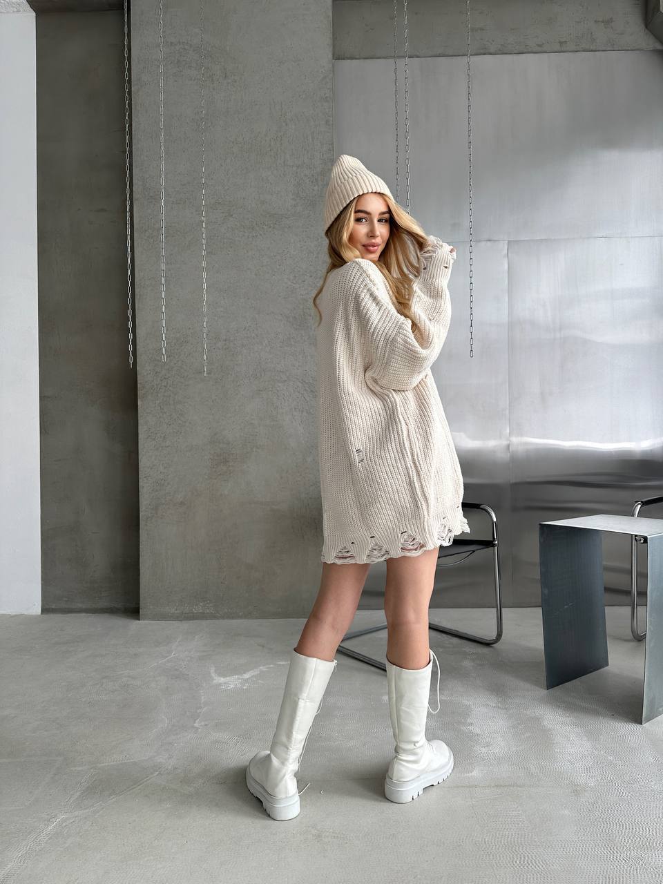 Женский Удлиненный Вязаный Молочный Свитер Оверсайз Рваный