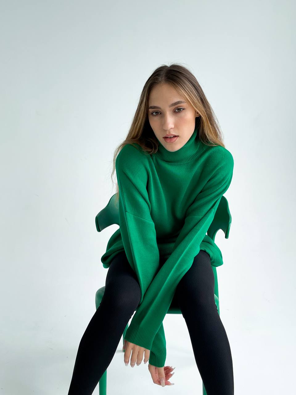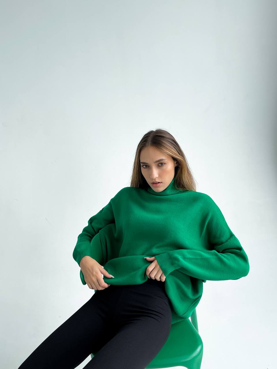 Женский Удлиненный Зеленый Свитер – Базовый Однотонный с Воротником под Горло