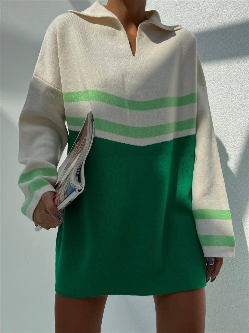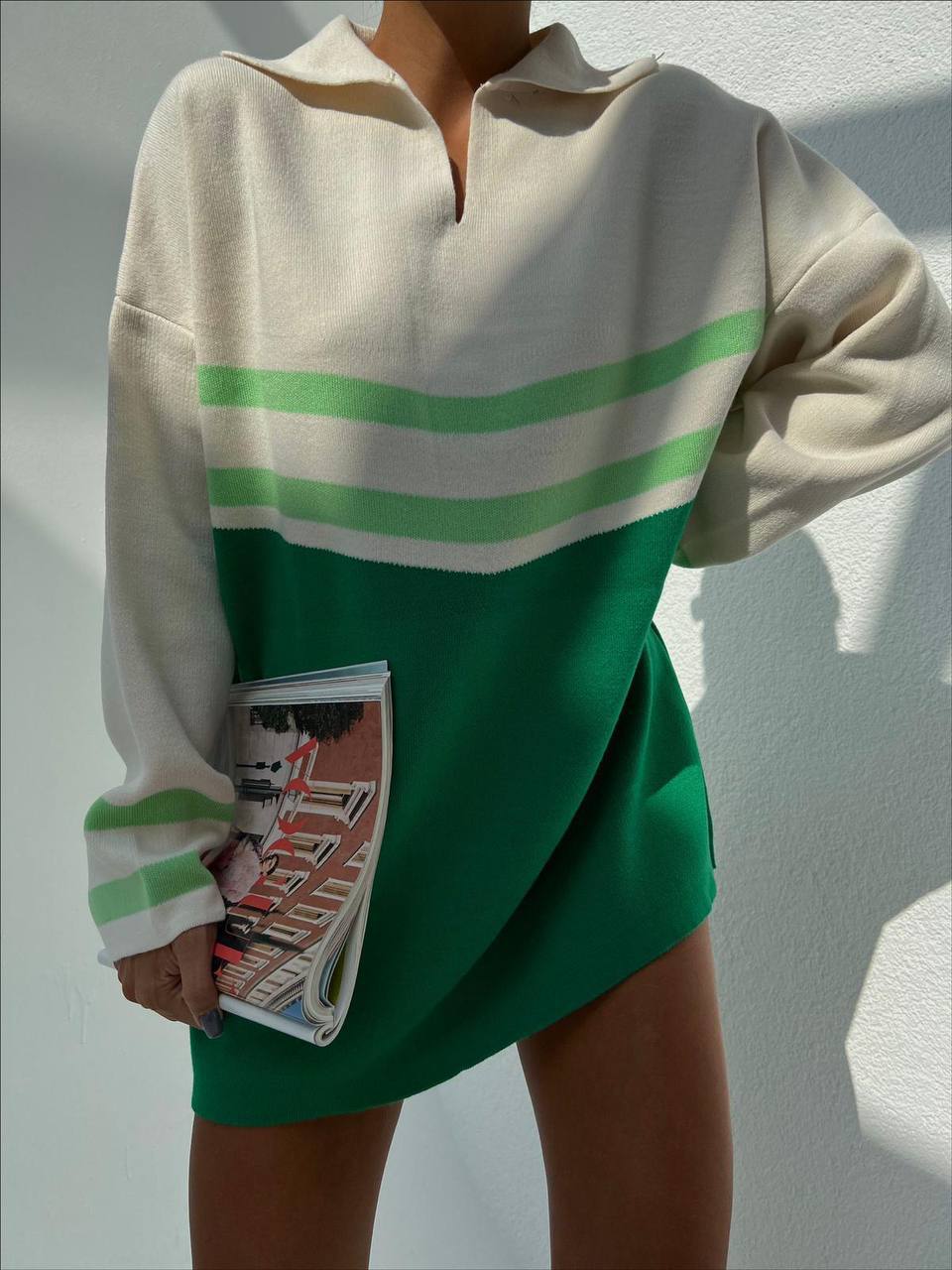 Женский Зеленый Свитер Поло – Удлиненный Свободного Кроя с Полосками