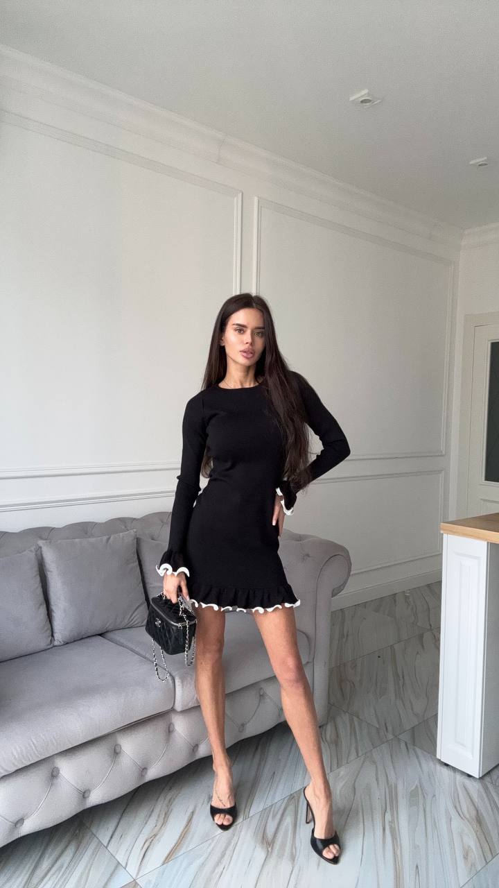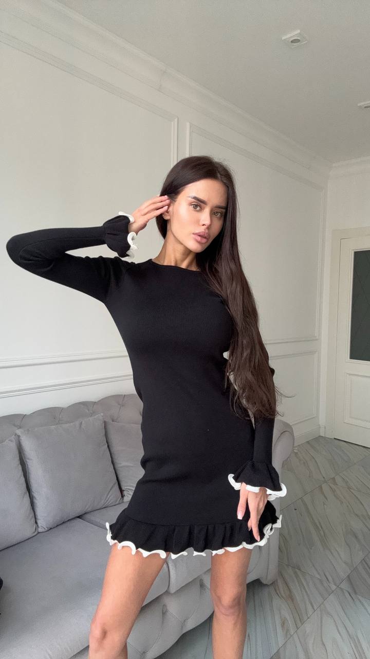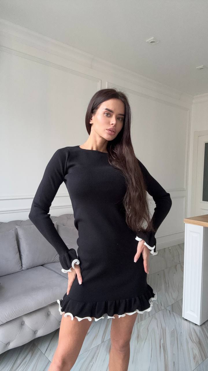 Женское Приталенное Черное Платье Мини с Окантовкой и Воланами