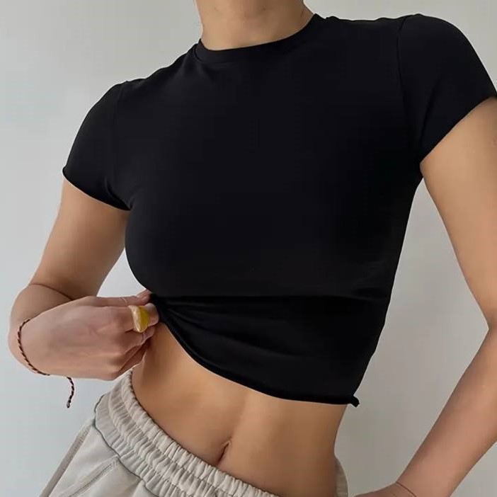 Женская Облегающая Черная Футболка – Укороченная с Короткими Рукавами