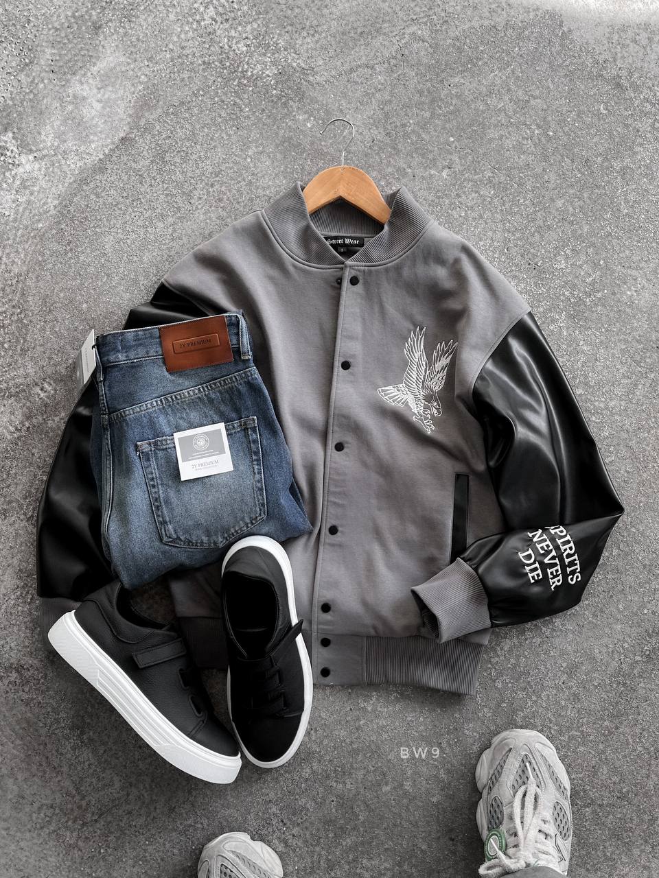 Чоловічий Темно-Сірий Бомбер зі Шкіряними Рукавами на Кнопках Принт Орел