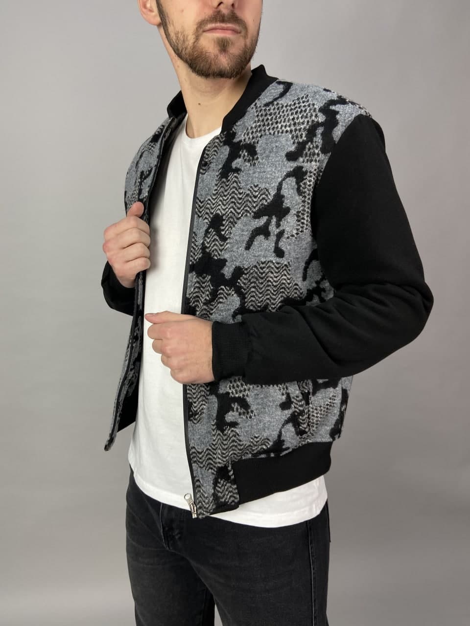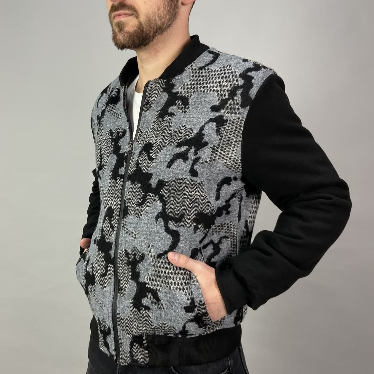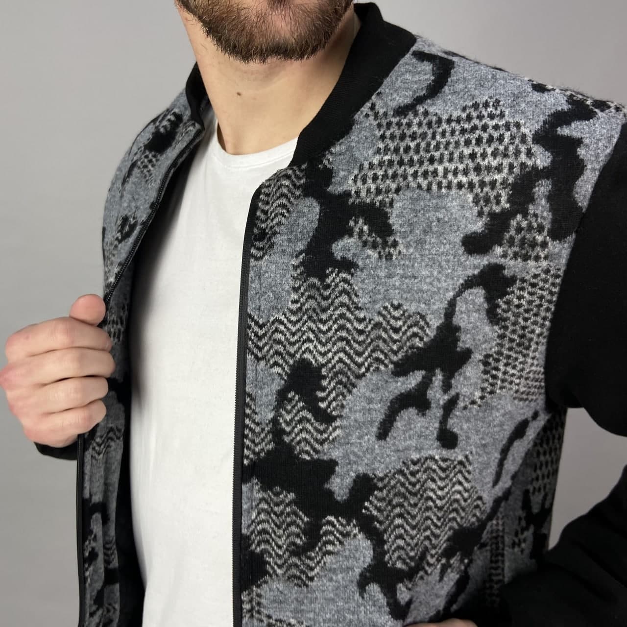 Будьте першим, хто залишив відгук “Чоловічий Чорний Сірий Бомбер Куртка – на манжетах з візерунком”“ Скасувати коментар