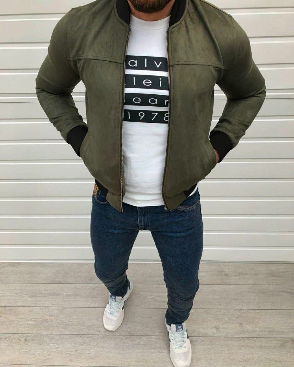 Чоловічий Замшевий Бомбер Хакі на Змійці з Манжетами