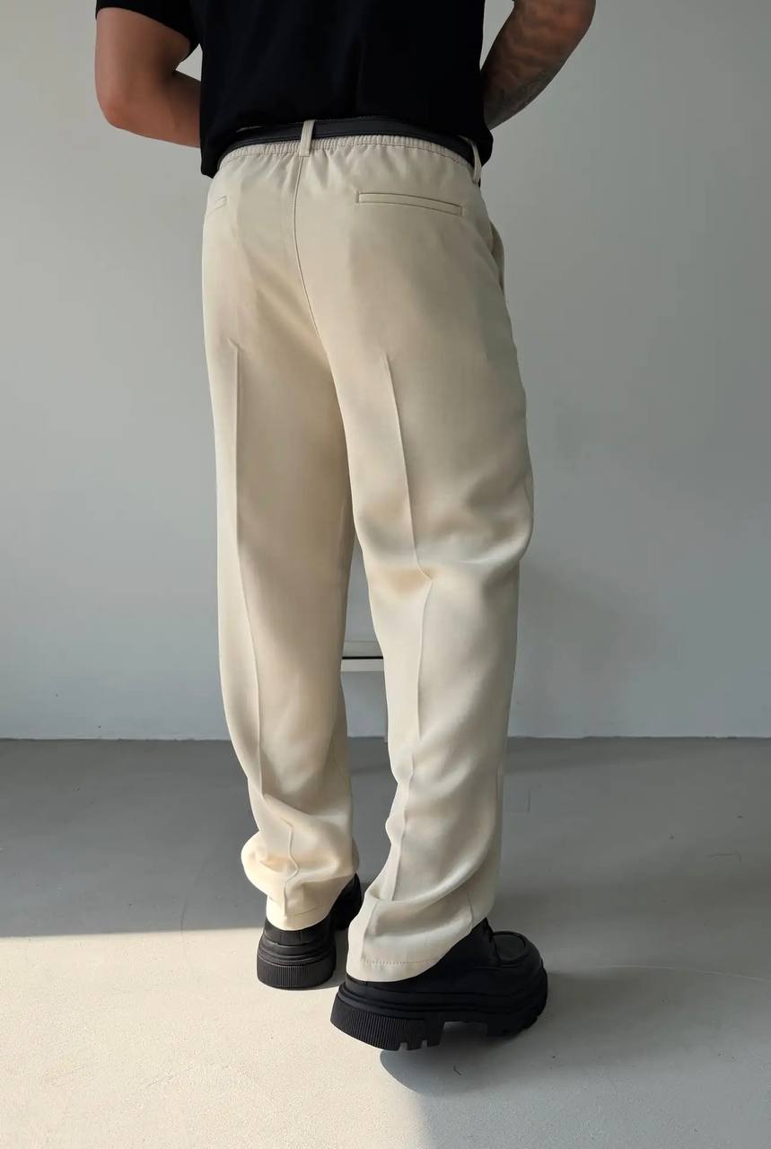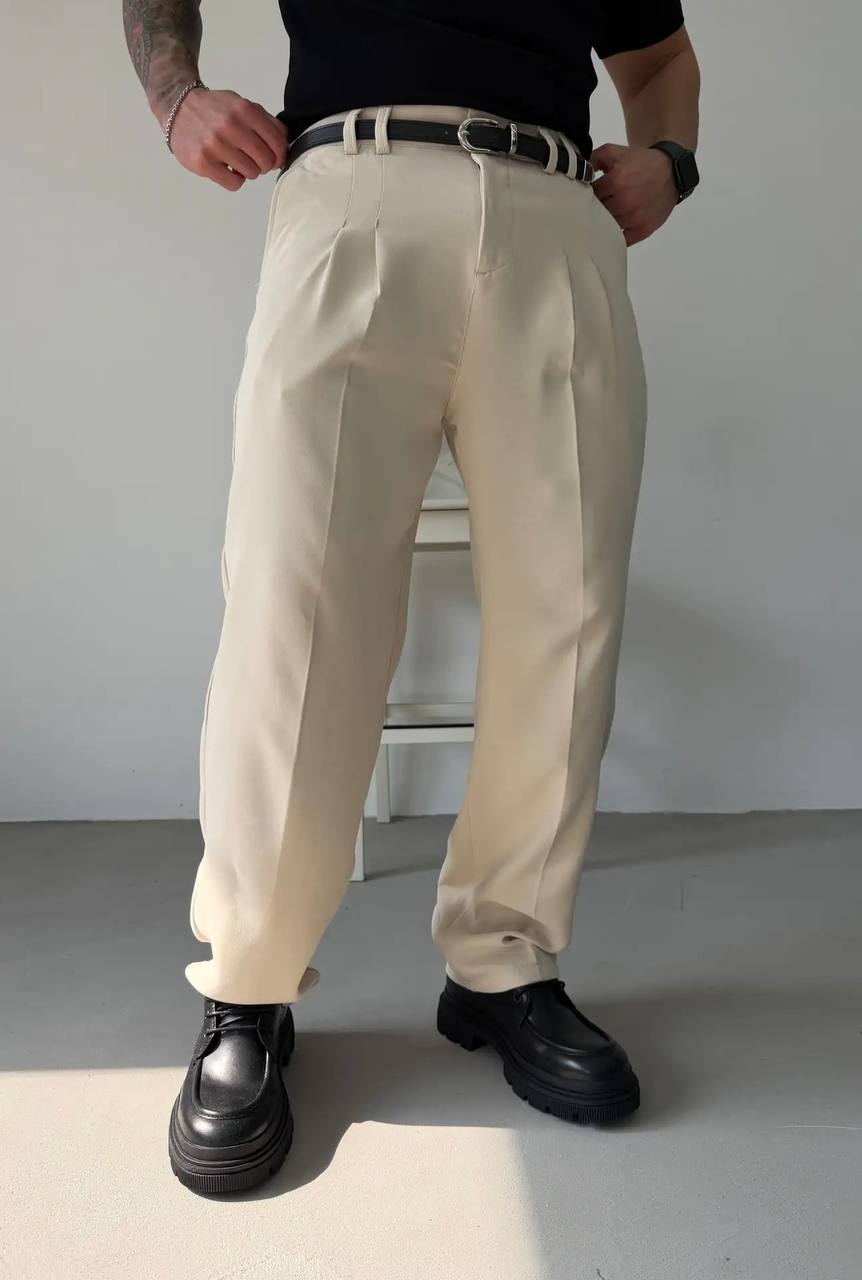 Чоловічі Класичні Широкі Бежеві Штани Брюки Баггі із Защіпами та Стрілками