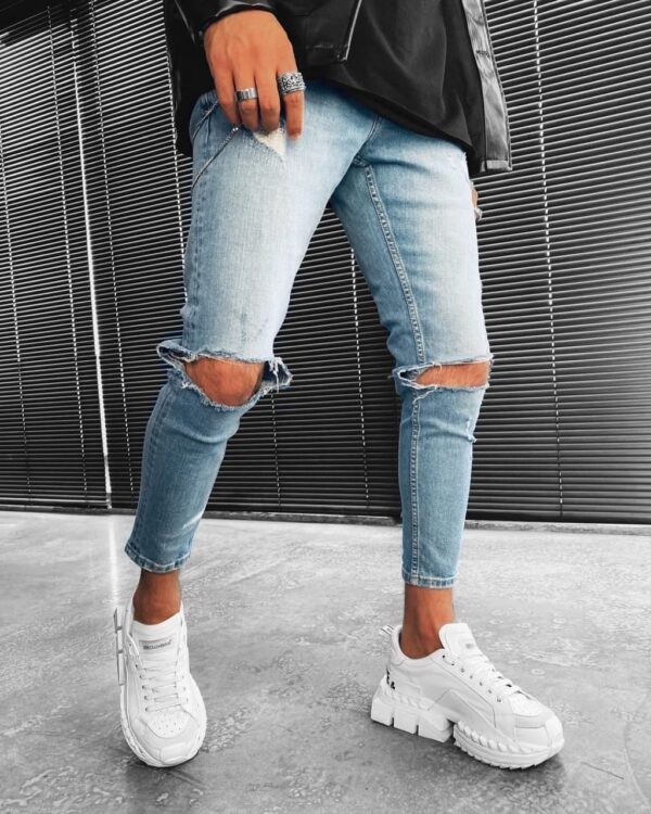 Чоловічі Сині Джинси з Ланцюгом – Вузькі з Рваними Колінами та Потертостями