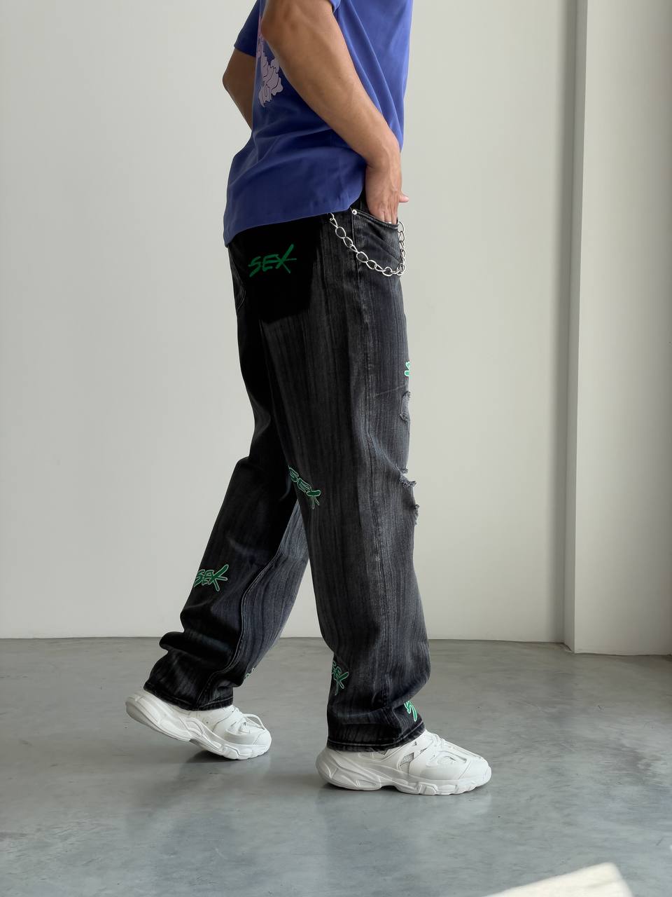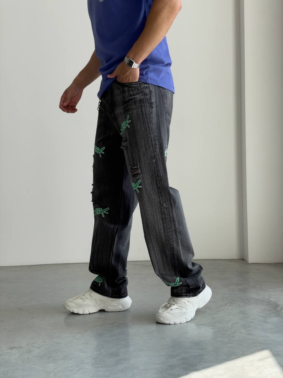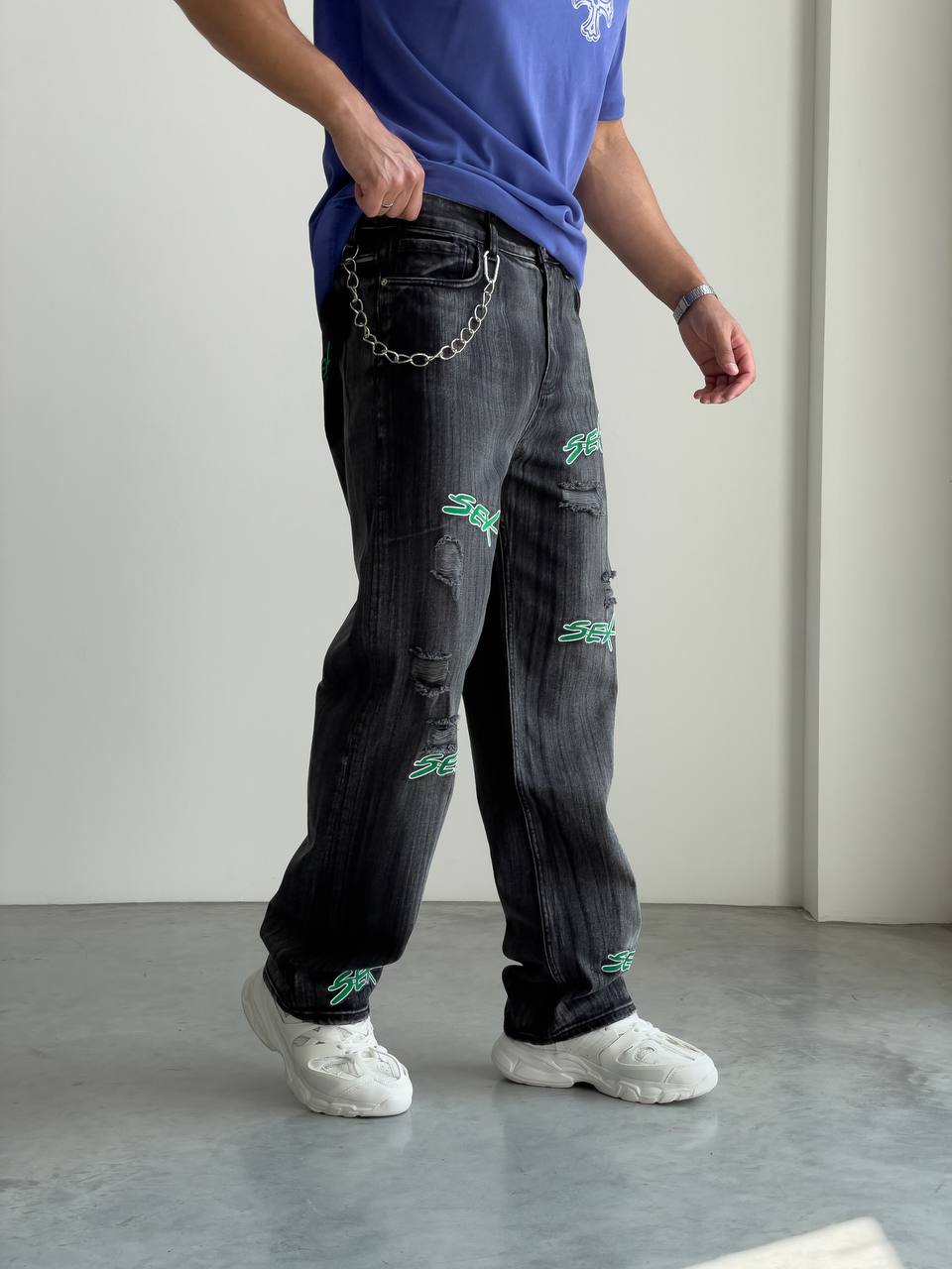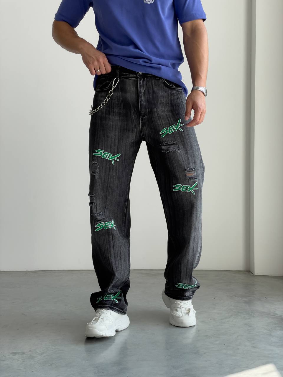 Чоловічі Широкі Рвані Графітові Джинси Баггі з Принтами та Ланцюгом