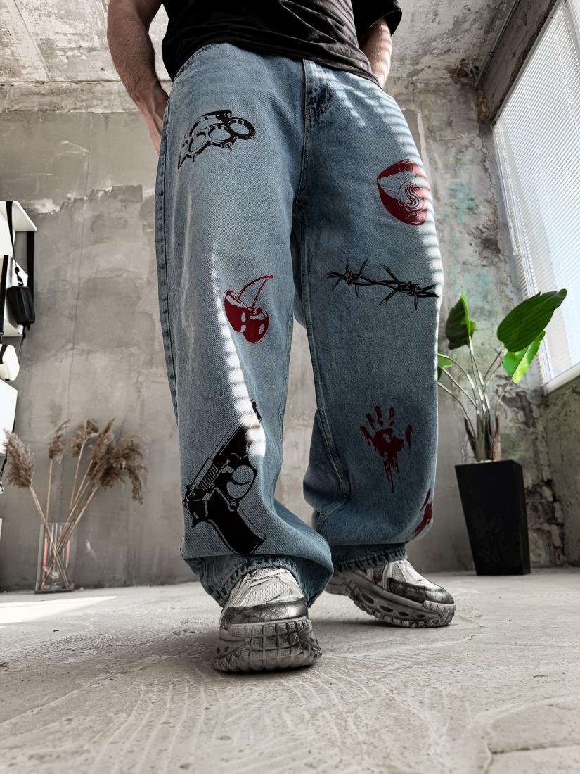 Чоловічі Сині Джинси Баггі – Широкі з Принтами