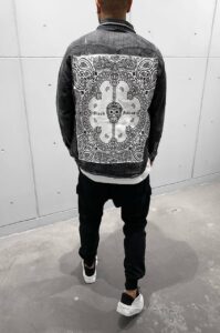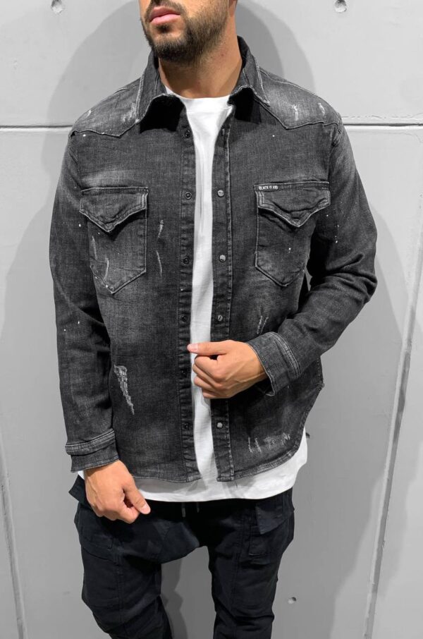 Чоловіча Темна Сіра Джинсова Сорочка з Потертостями та Бризками Фарби – Джинсівка з Нашивкою Принтом на Спині