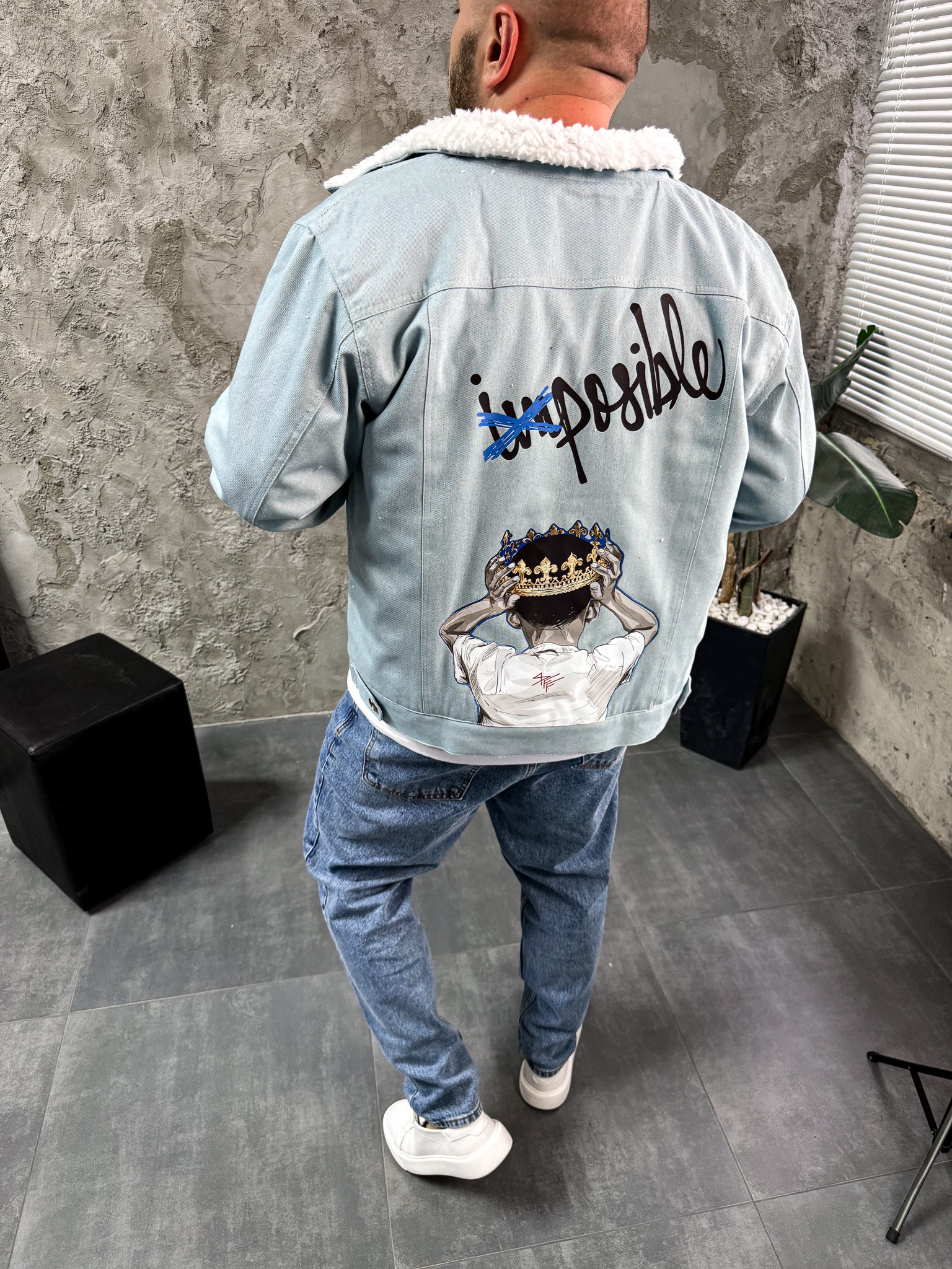 Чоловіча Тепла Блакитна Джисова Куртка на Хутрі – Джинсовка Вільного Крою з Принтами