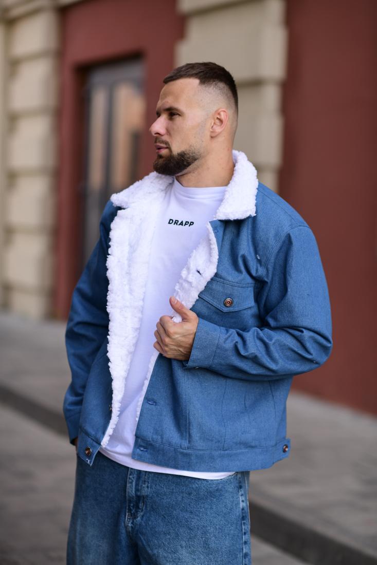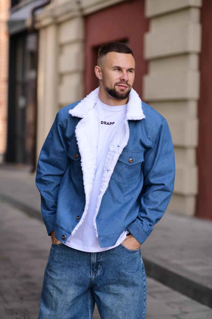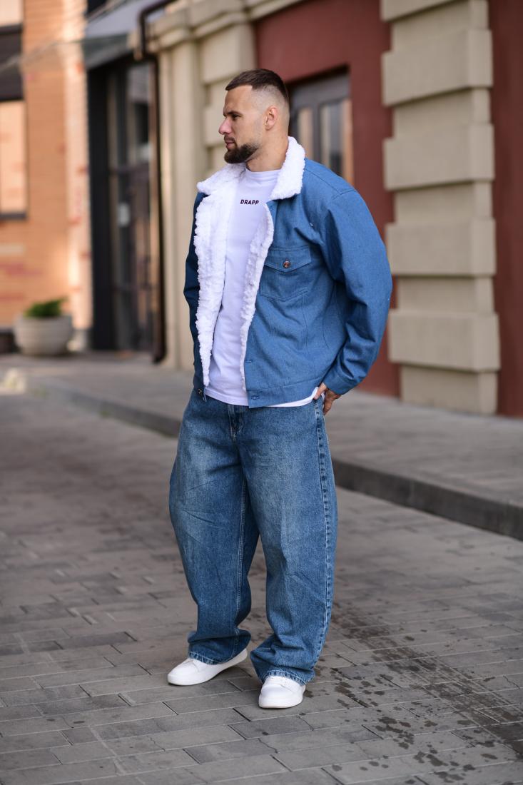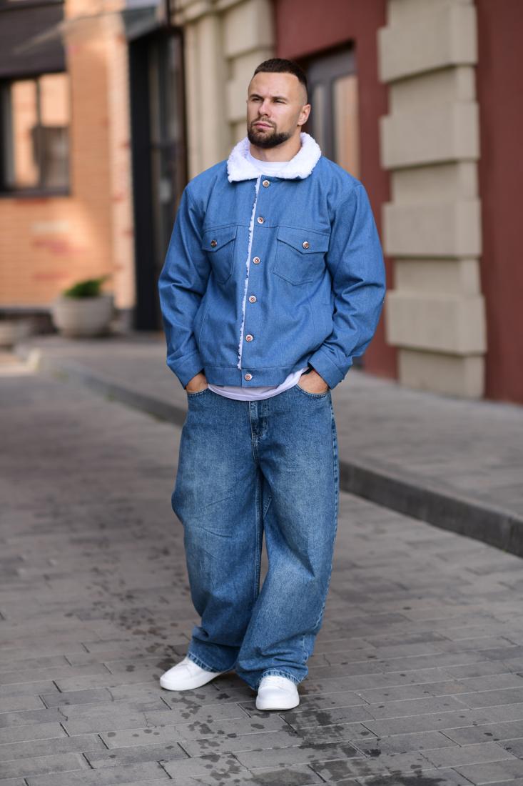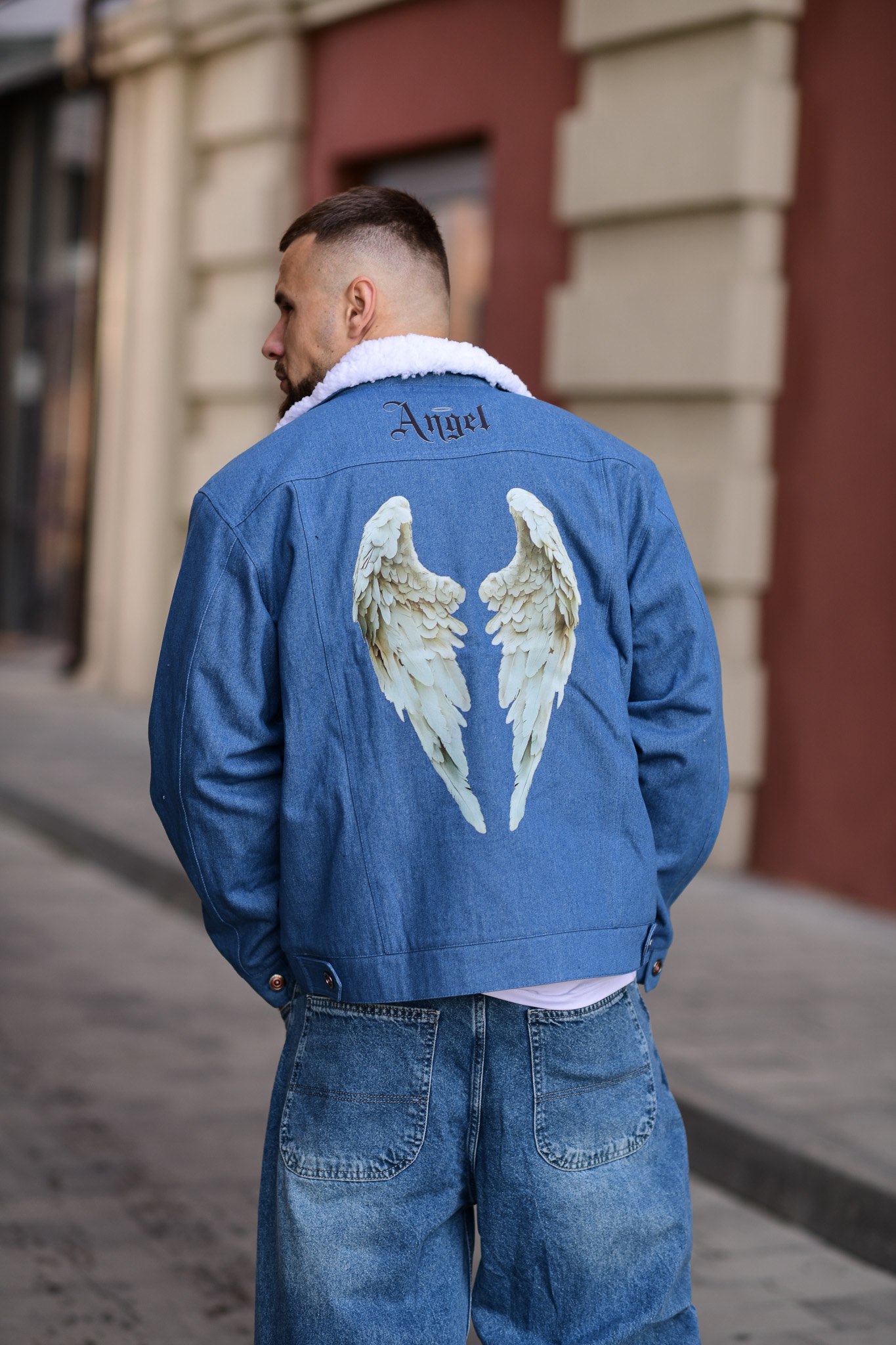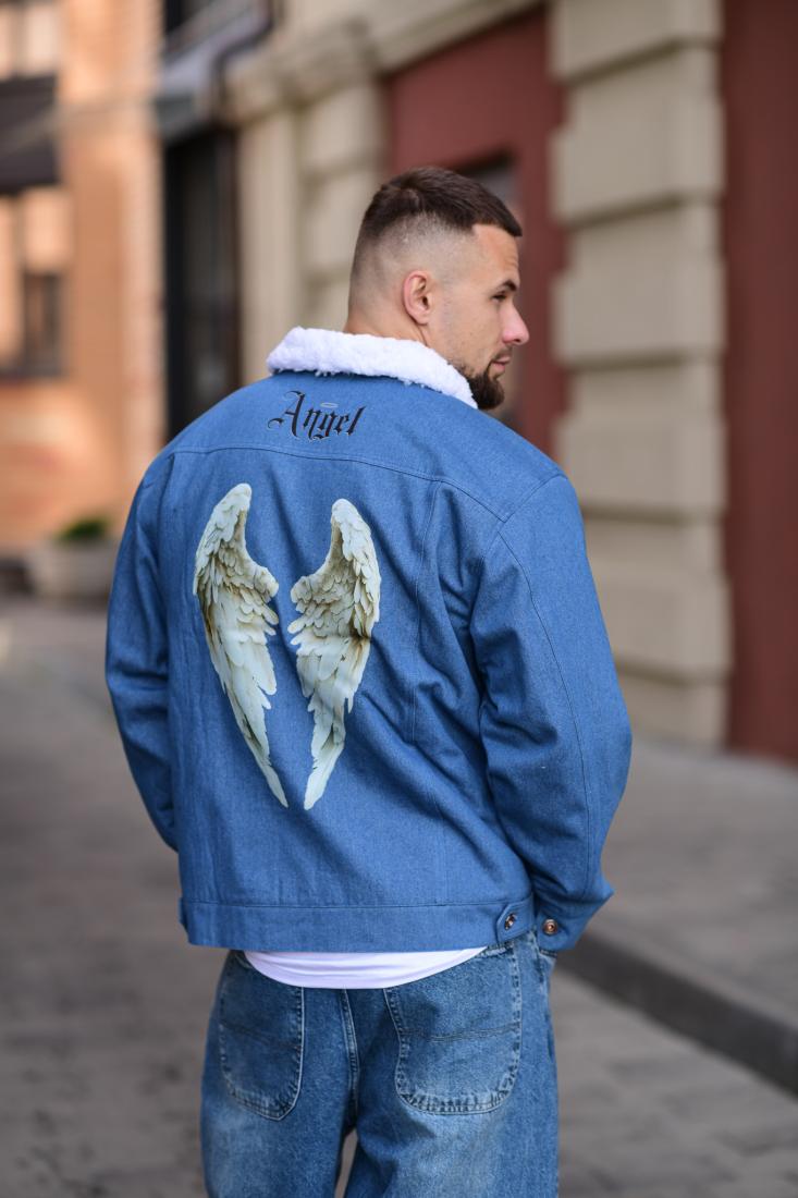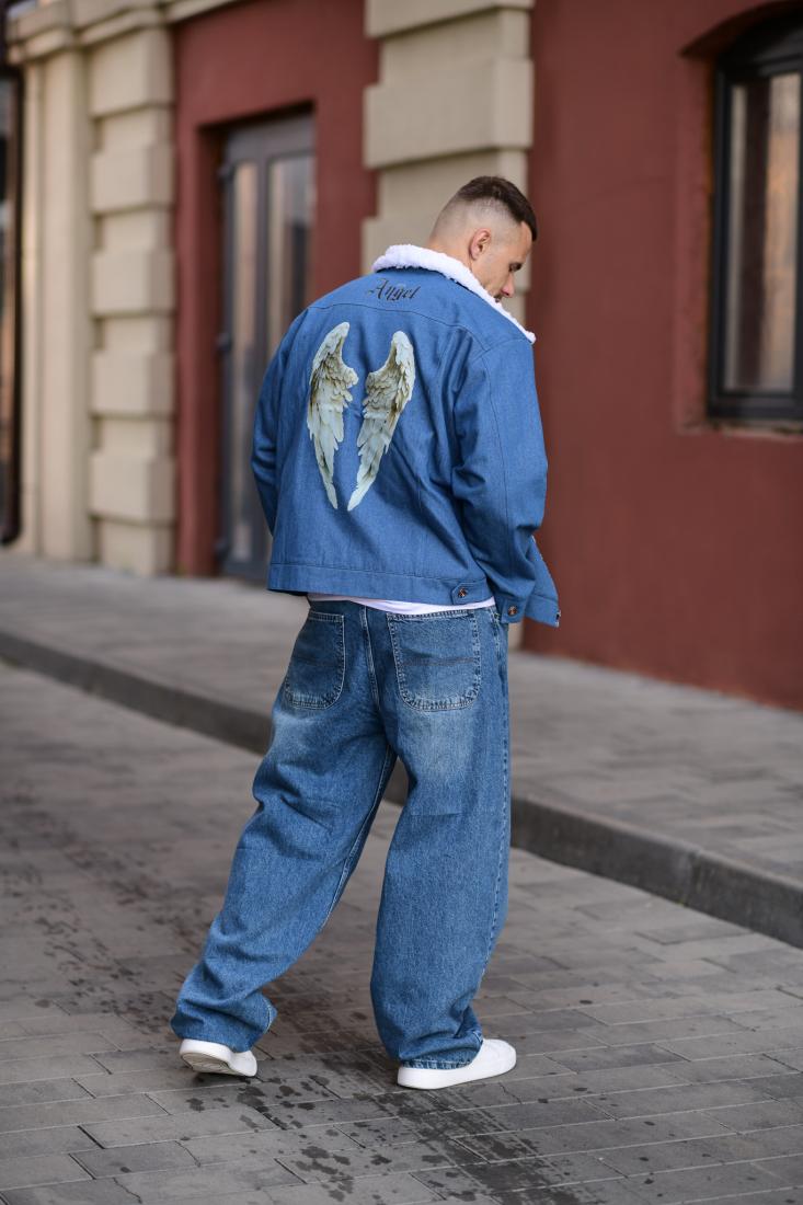 Чоловіча Тепла Синя Джисова Куртка на Хутрі – Джинсовка Вільного Крою з Принтом Крила на Спині