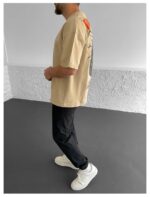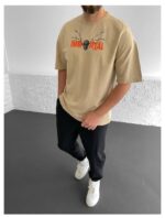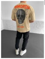 Чоловіча Бавовняна Бежева Футболка Варенка Оверсайз з Принтом Черепом та Написами