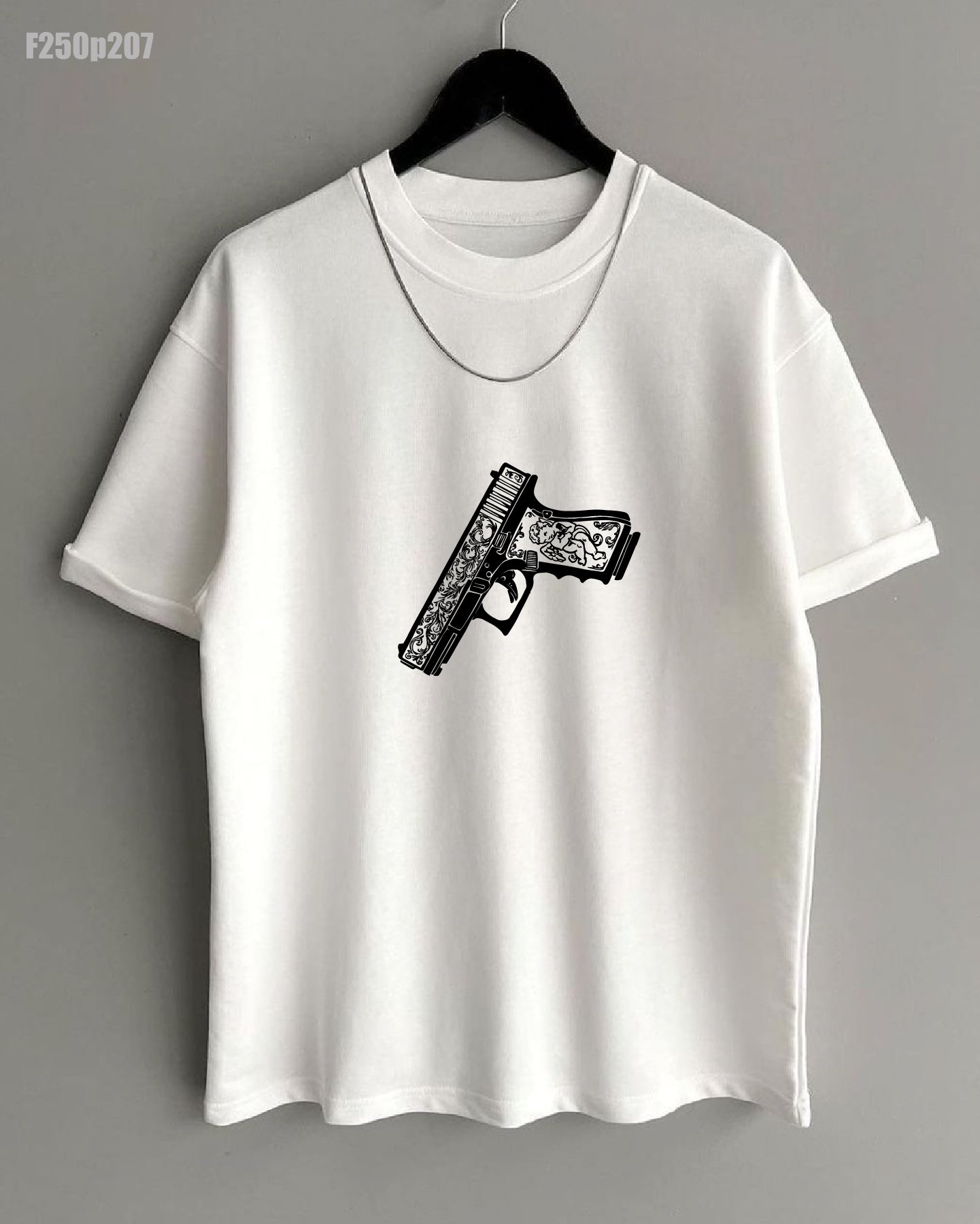 Чоловіча Базова Біла Футболка Бавовна – Вільного Крою з Принтом Пістолет
