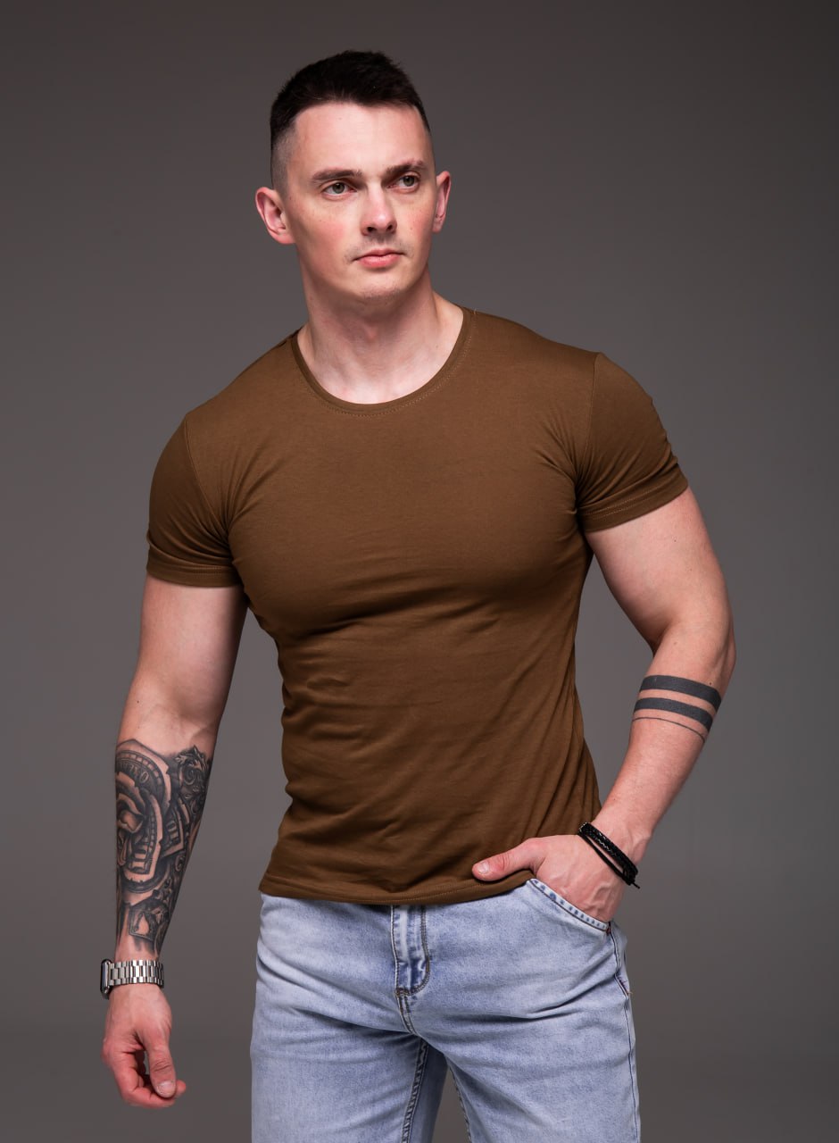 Чоловіча Базова Приталена Коричнева Футболка з Круглим Вирізом