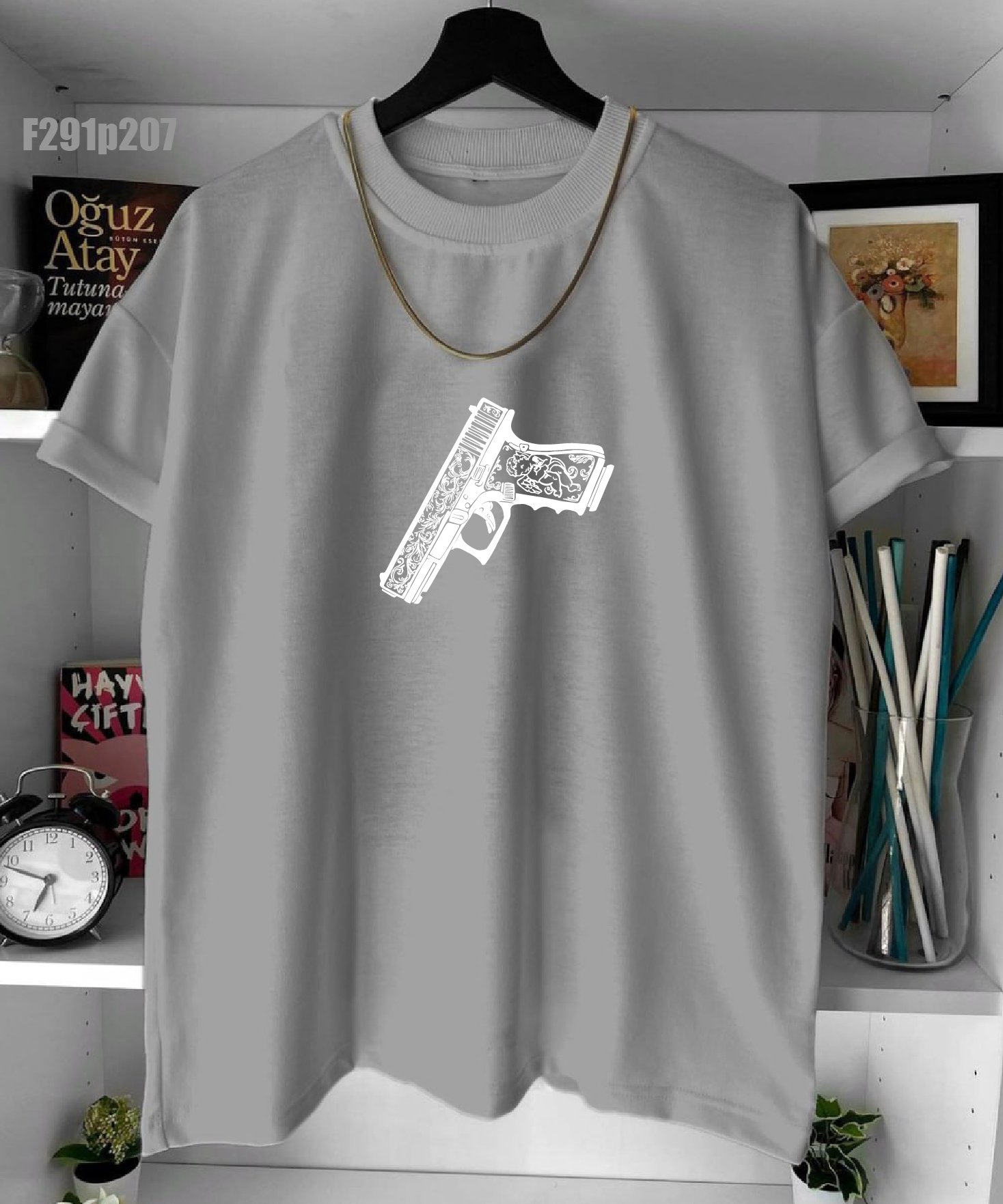 Чоловіча Базова Сіра Футболка Бавовна – Вільного Крою з Принтом Пістолет
