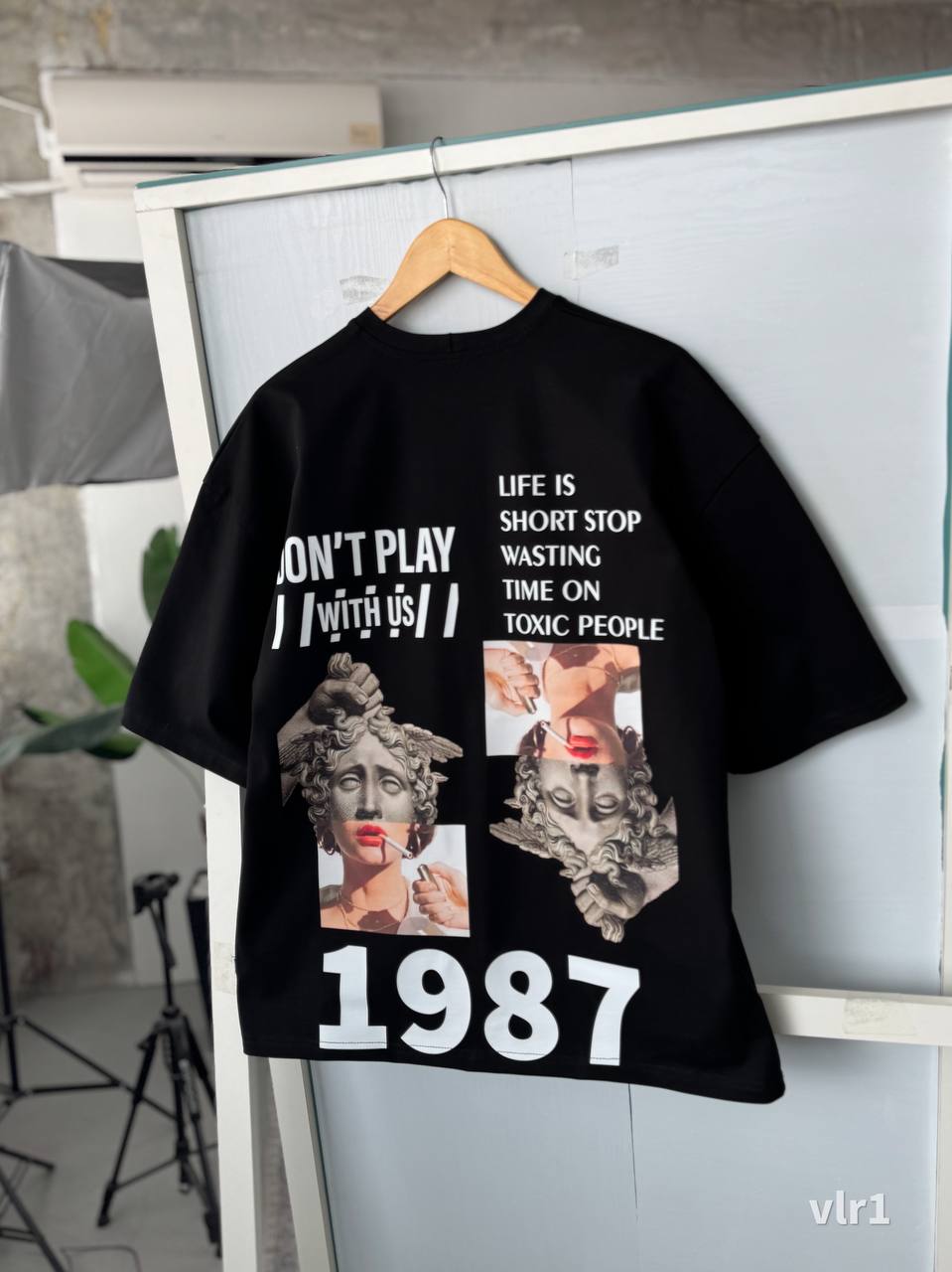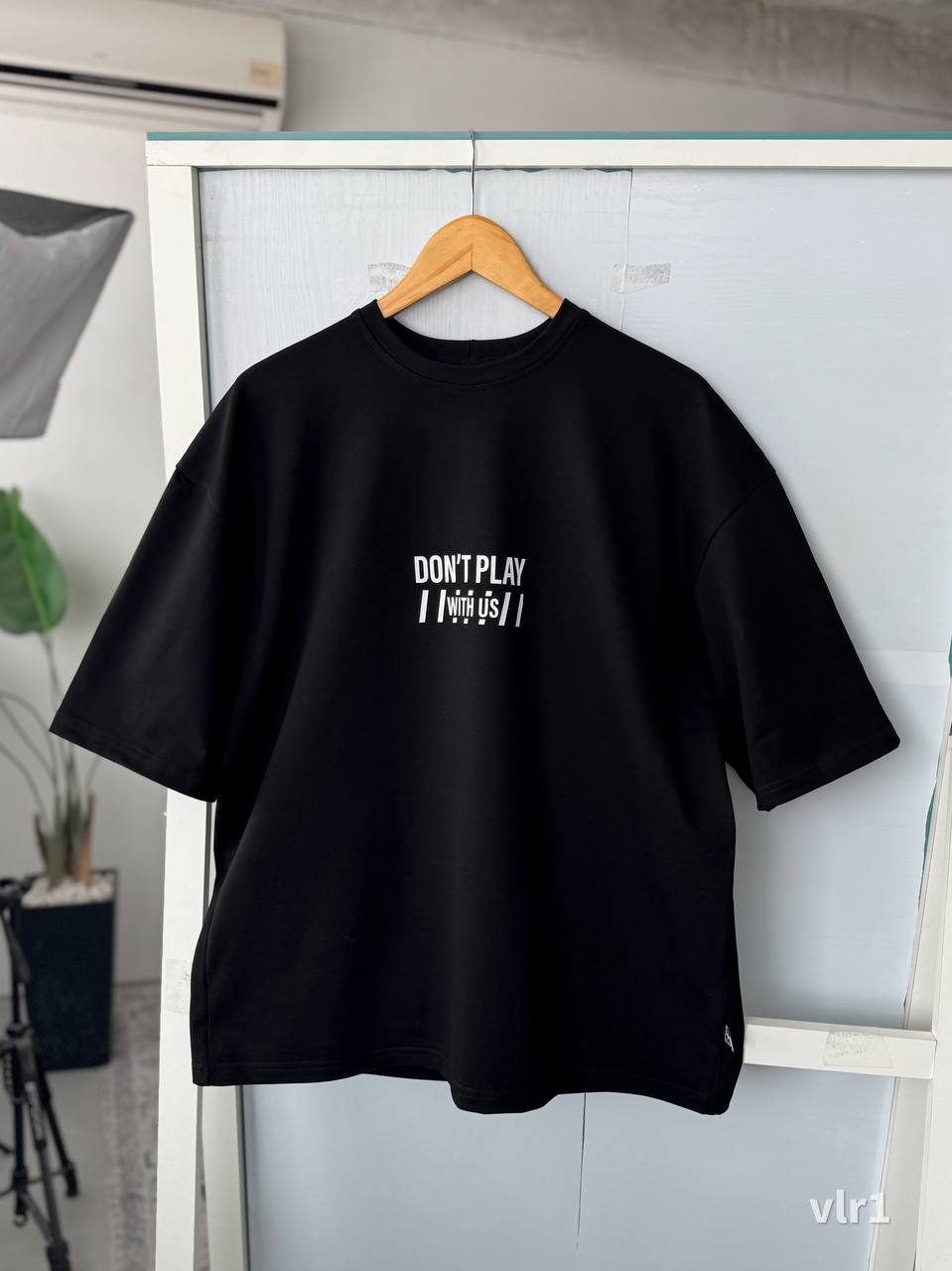 Чоловіча Чорна Футболка Кулір Оверсайз з Принтами на Спині