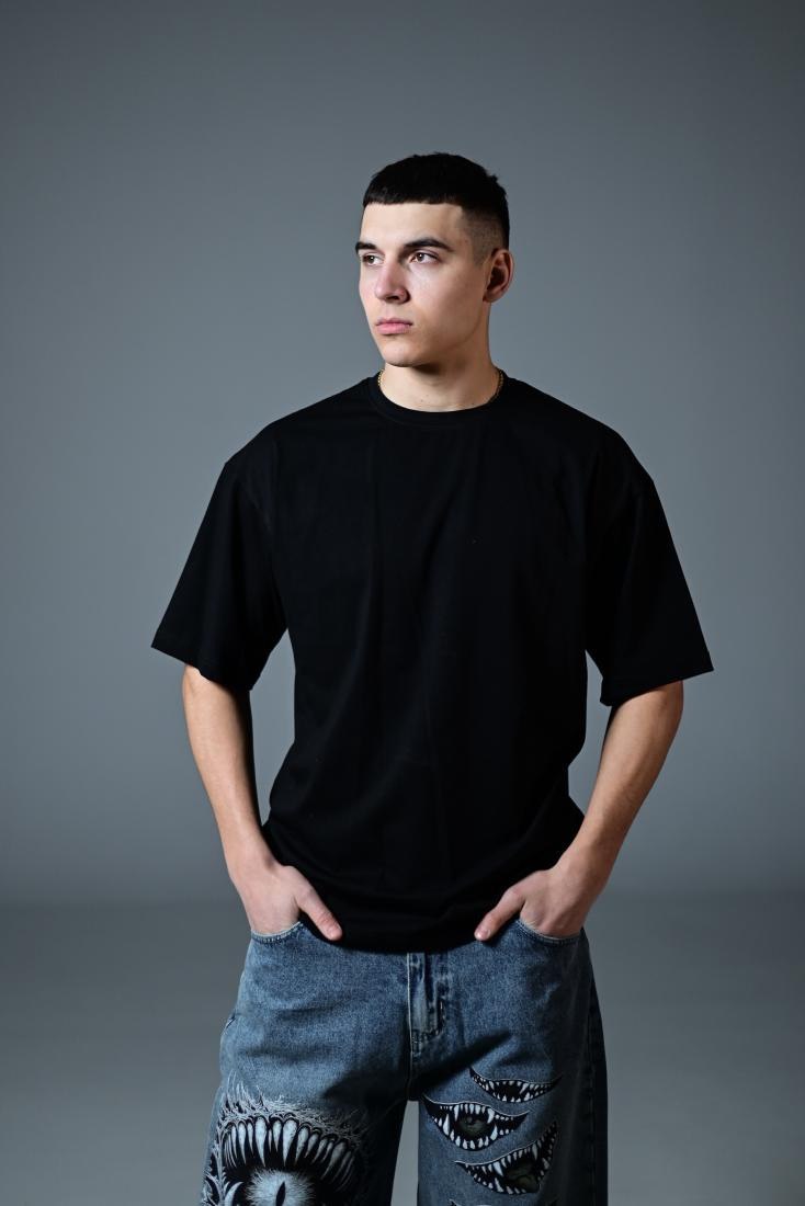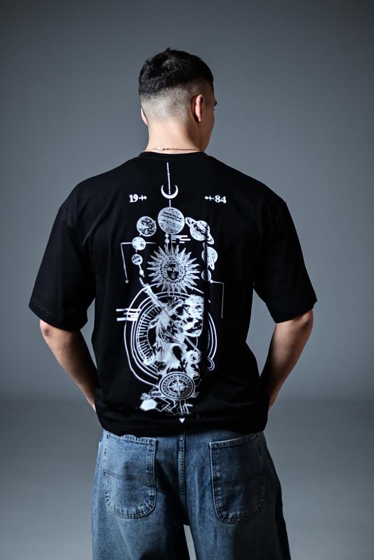 Чоловіча Чорна Футболка Оверсайз Бавовна з Принтом Сонячна Система на Спині