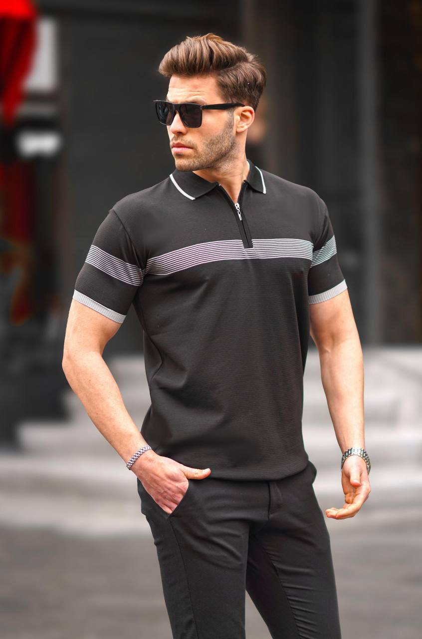 Чоловіча Чорна Футболка Поло з Сірими Смужками Окантовкою