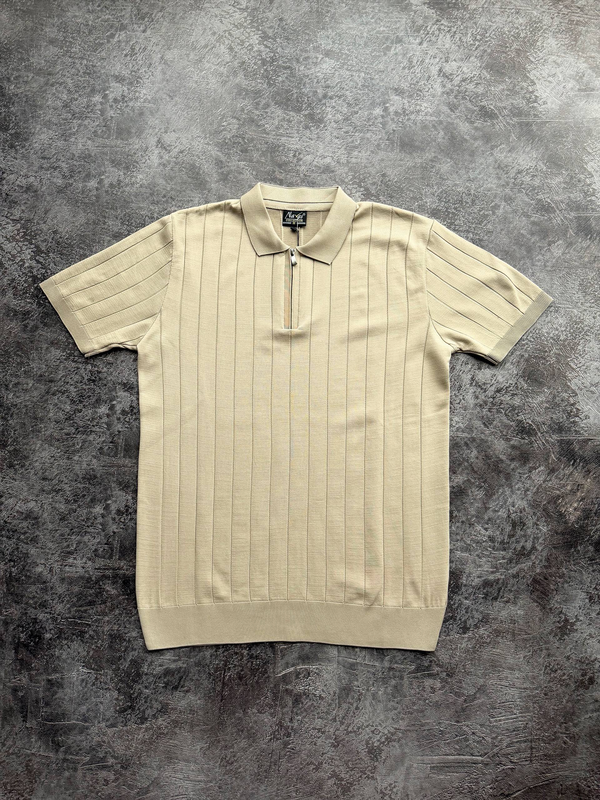 Чоловіча Класична Бежева Футболка Поло у Широкий Рубчик з Коміром на Замку