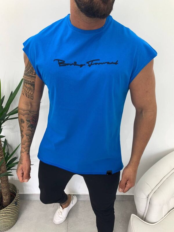 Чоловічі футболки Синя Без Рукавів – з Написом та Необробленими Краями