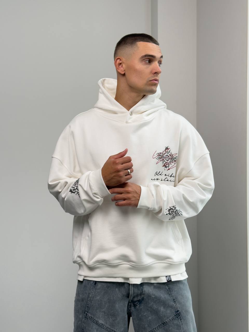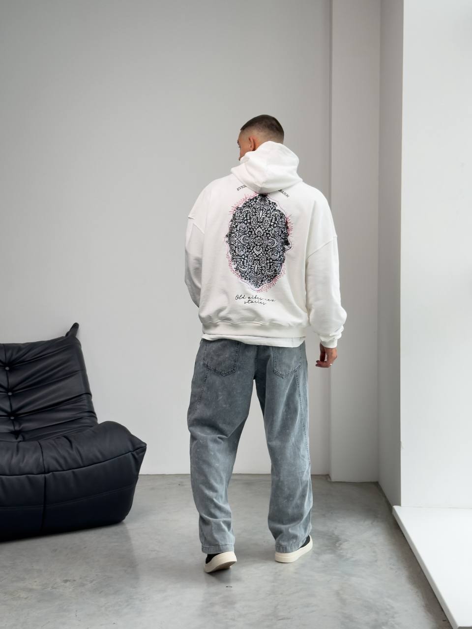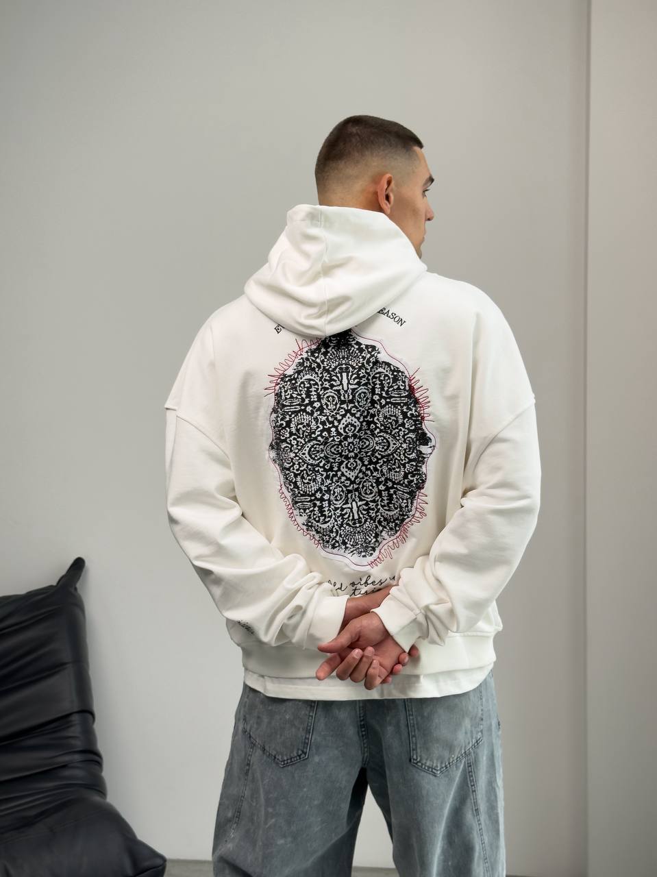 Чоловіче Біле Худі Оверсаз – Толстовка з Принтами та Нашивкою на Спині