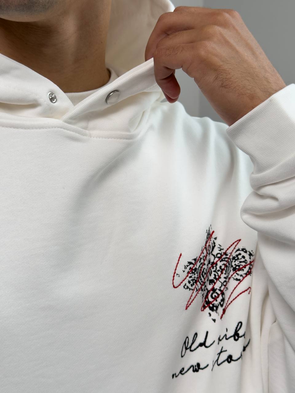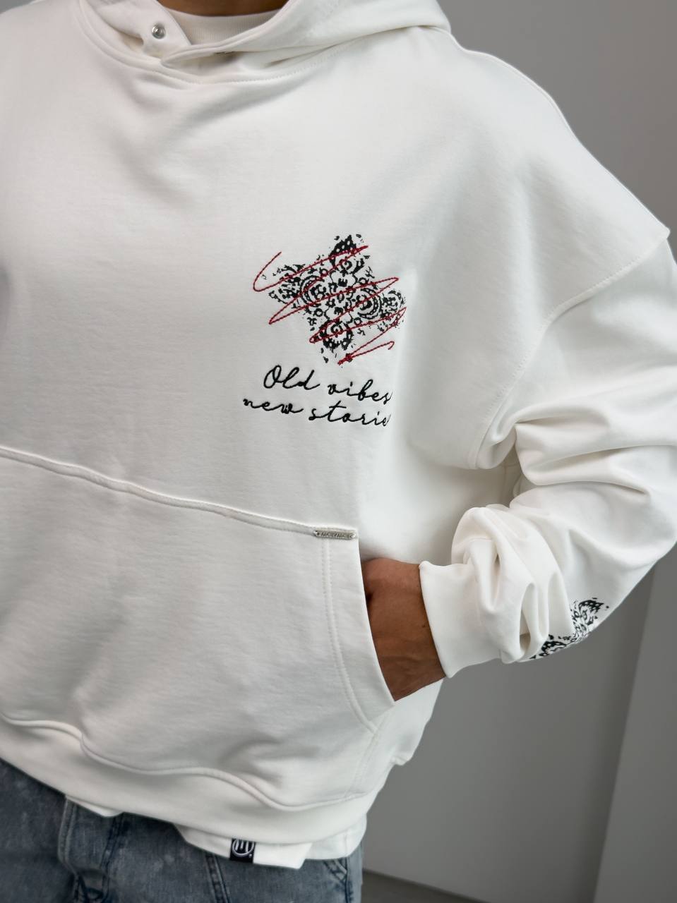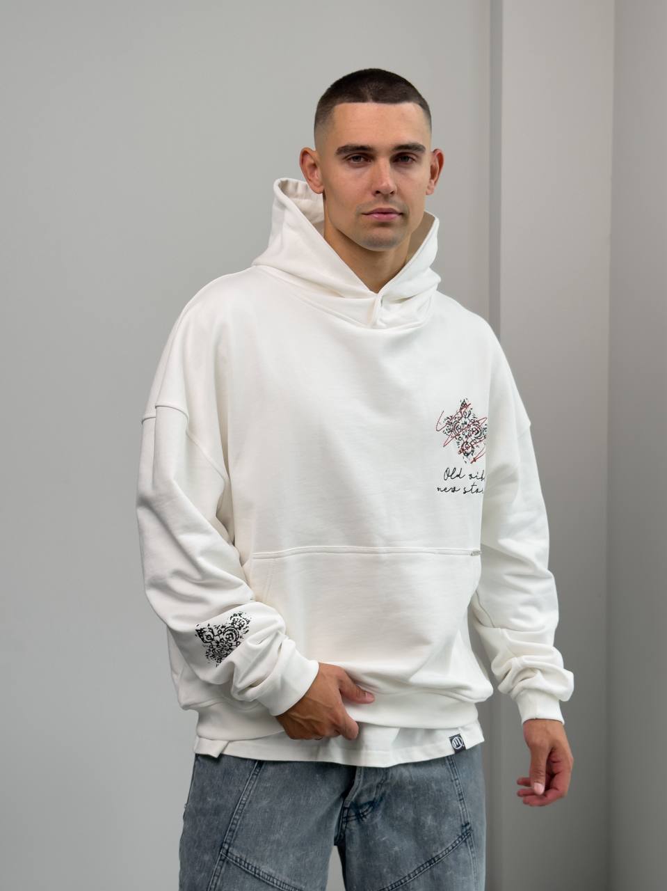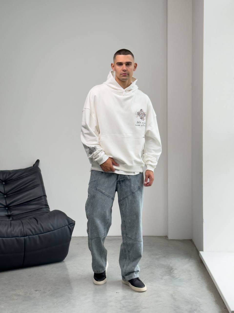Чоловіче Біле Худі Оверсаз – Толстовка з Принтами та Нашивкою на Спині