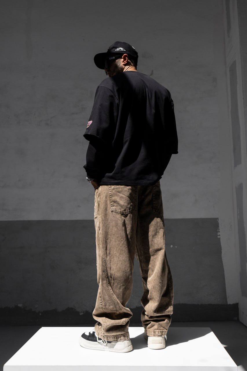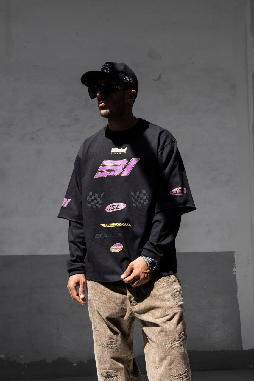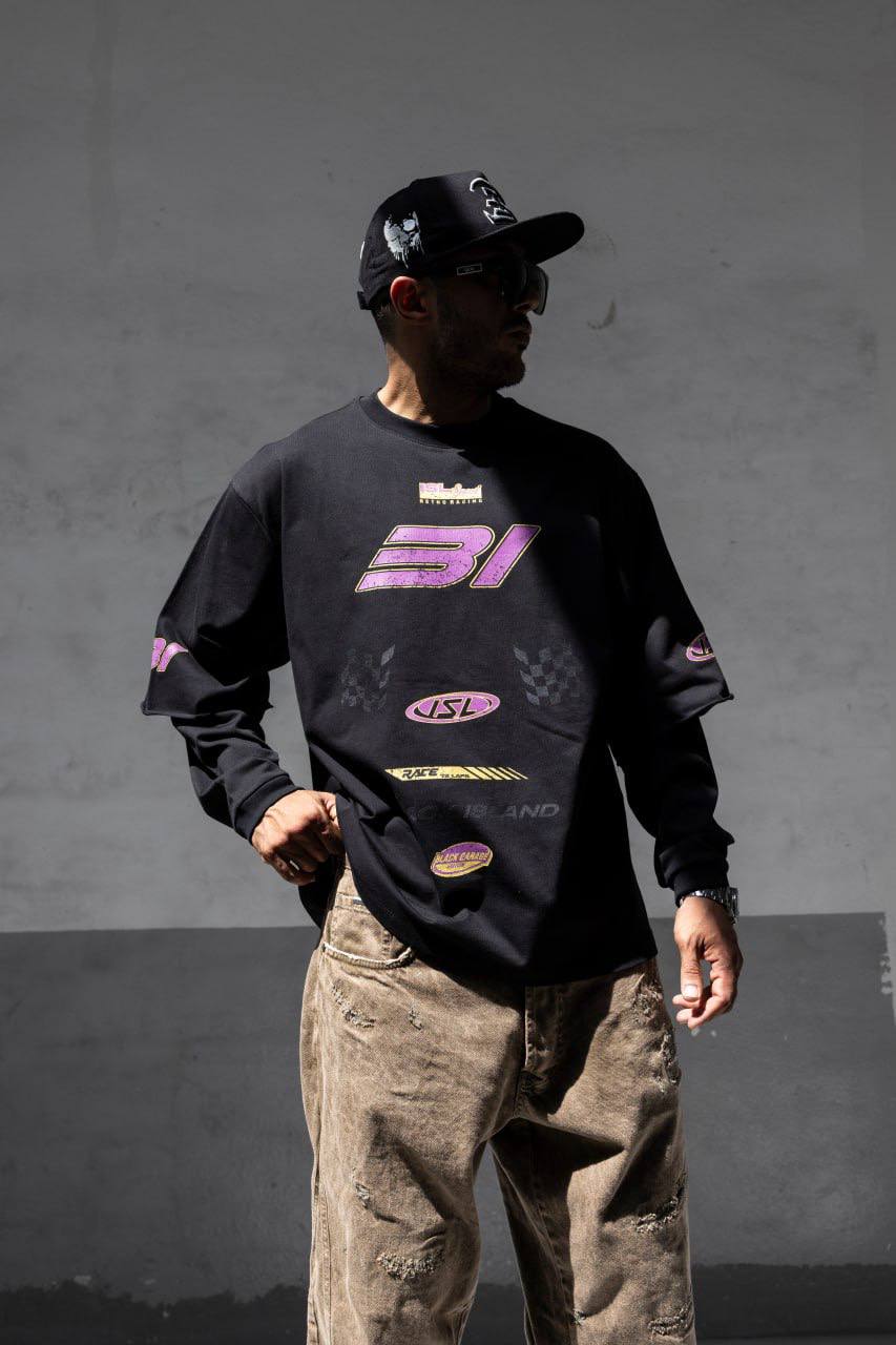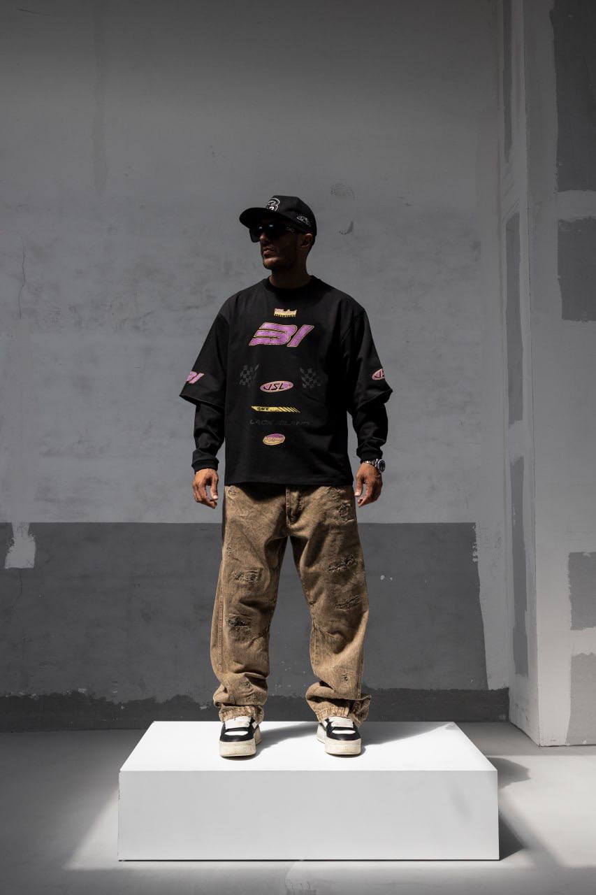 Чоловічий Чорний Світшот Оверсайз у Прінт з Подвійними Рукавами